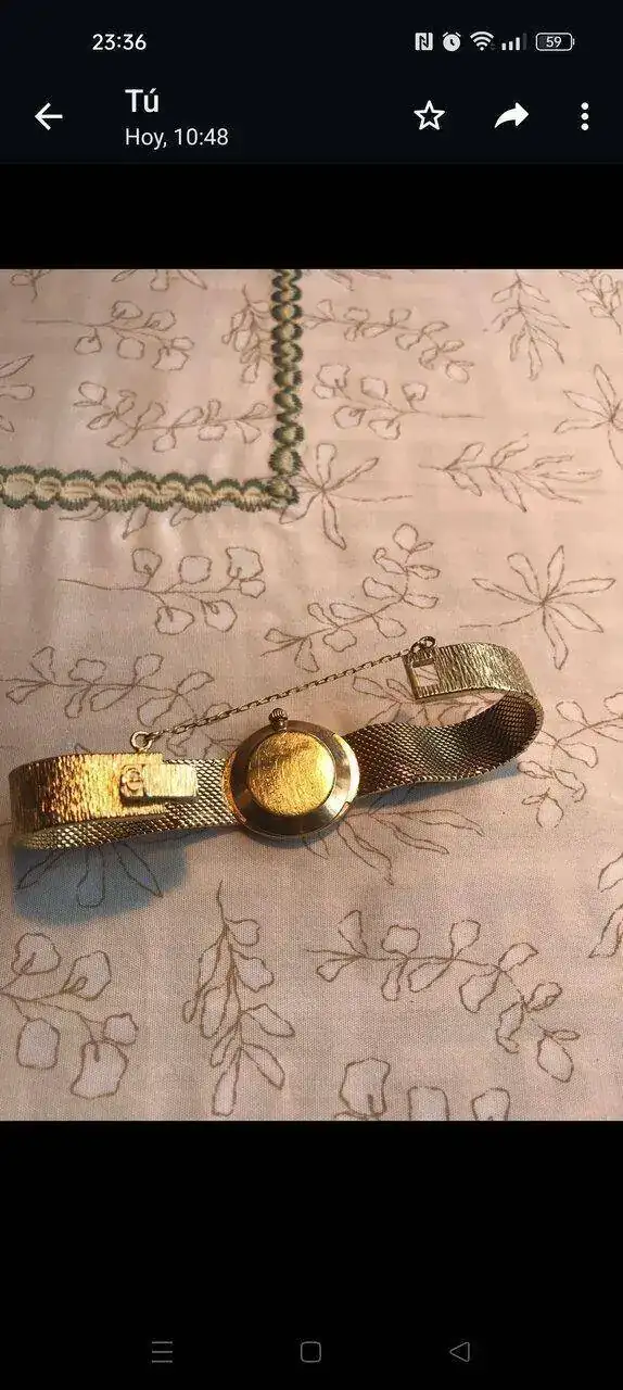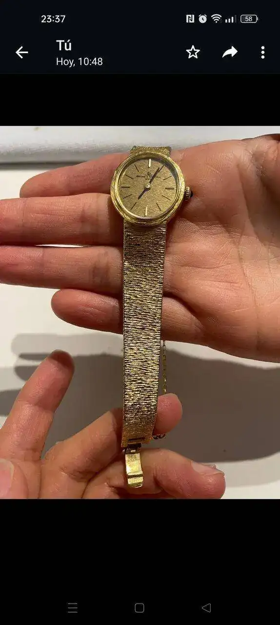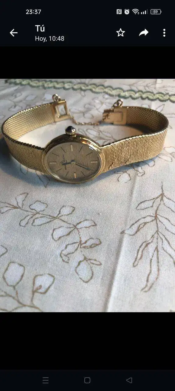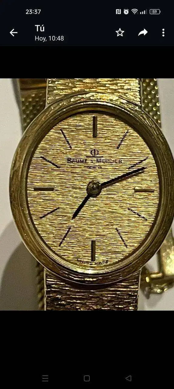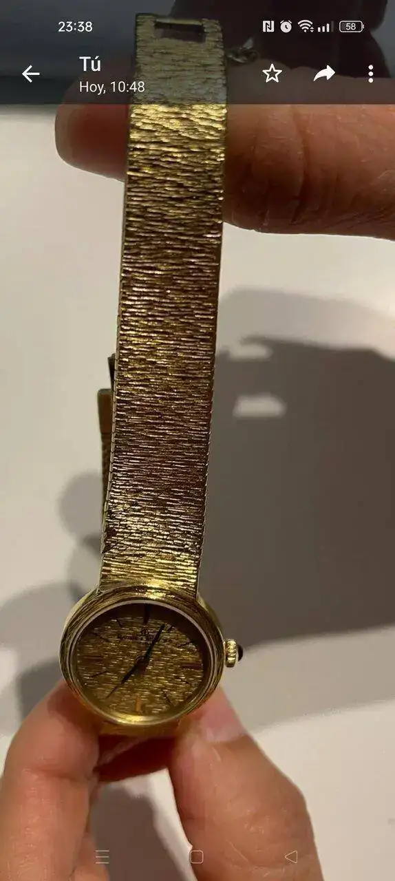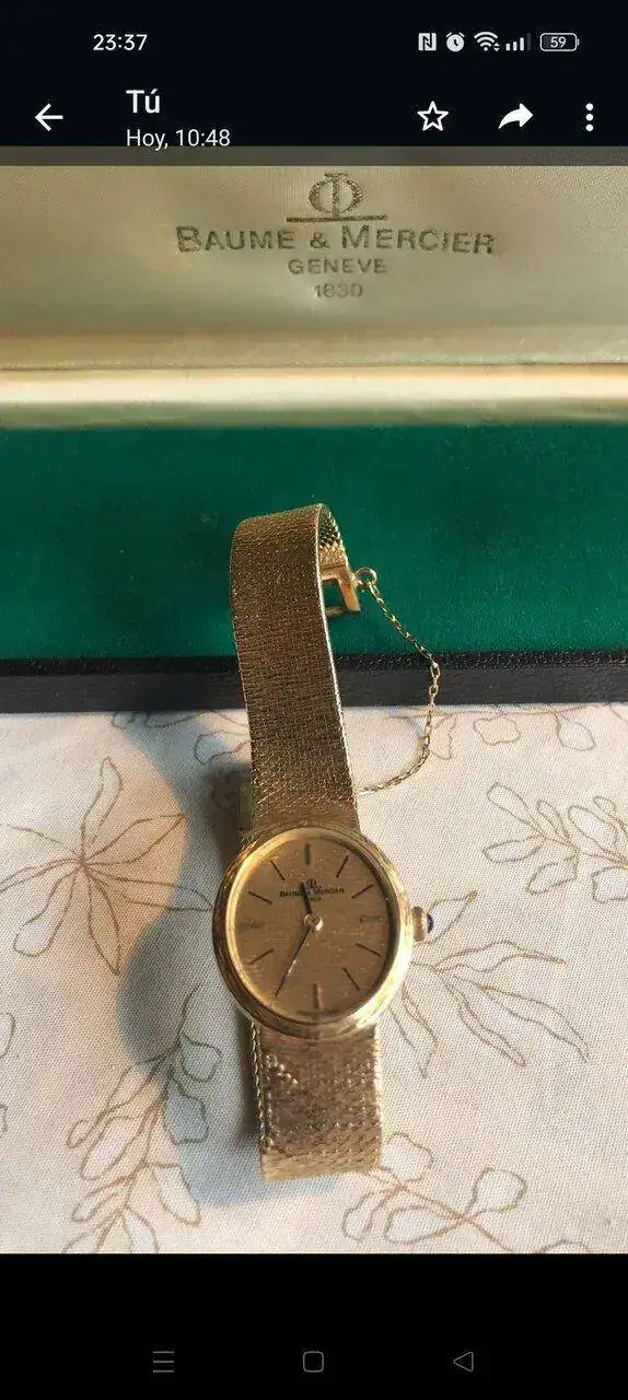 Tengo este reloj de la abuela de los años 70,es un Baume & Mercier de oro de 18 kilates macizo,que pesa unos 44 gramos,va a cuerda y tiene un pequeño zafiro en la corona.