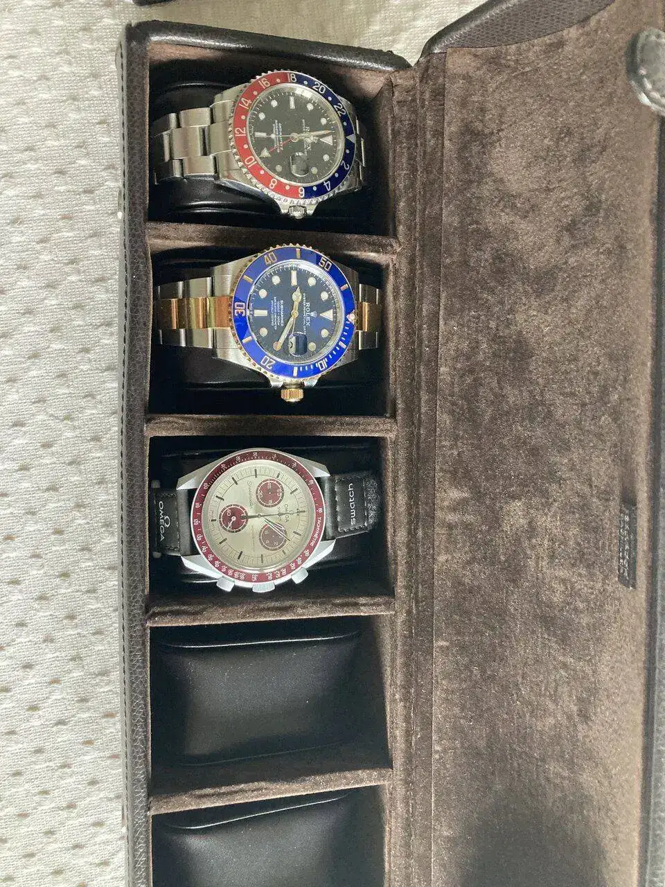 Al leer eso, después de mirarlo, creo que los Rolex deberían pasar a la caja completa y los Omega (en el sentido amplio) estar juntos en la primera caja. Tengo la sensación que tanto el Swatch como el Moonwatch se harían buena compañia, mejorando ambos su presencia solo por estar juntos.Impresionante. El swatch al lado de esos despinta muuucho. 😊