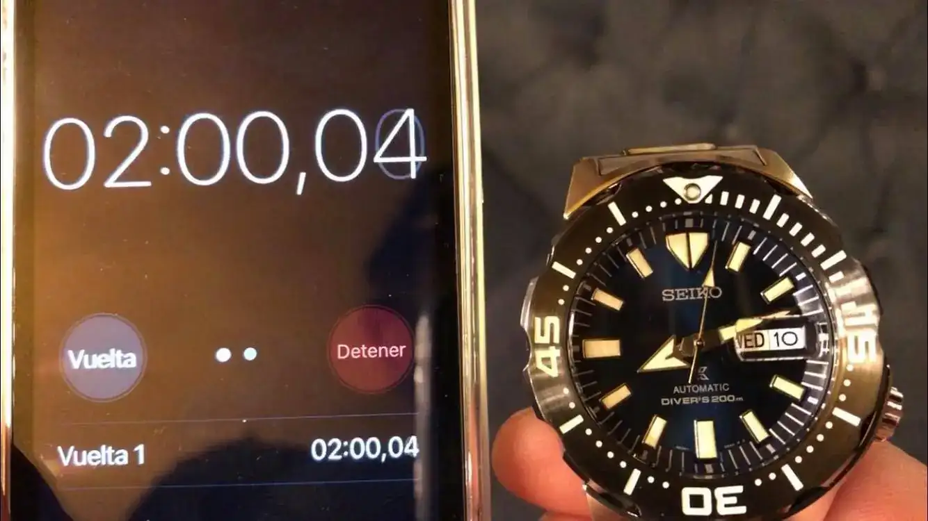Les envío el reloj y hoy me llega otro igual (Entre pitos y flautas, un mes) tras el cabreo que me supone estar un mes sin dinero y sin reloj, y que encima me digan que el armis está usado (Lo justo de una semana y su comprobación) y que me cambian el reloj pero no el armis, lo primero que hago es agitarlo un poco para que arranque, y comprobar la marcha con el cronómetro del movil. Quería ver lo antes posible si iba más o menos bien. Cual es mi sorpresa que en los cinco primeros minutos, me había adelantado 12 segundos!!!! ya sudando, le agito un rato más para ver si era por tener poca carga, y en un minuto agitando se me adelanta otros 4 o 6 segundos!! Cuando he ido a grabarlo en video para enviárselo al de la tienda solo he conseguido que adelantara 2 segundos en un minuto (Fotos adjuntas).