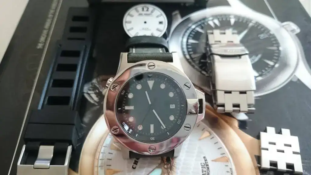 Tiene dos coronas, una sita a las 3 para activar el calibre y su cambio rápido de día y la segunda, sita a las 11,para activar el bisel interno de buceo. 200 metros de w.r.[/TD]