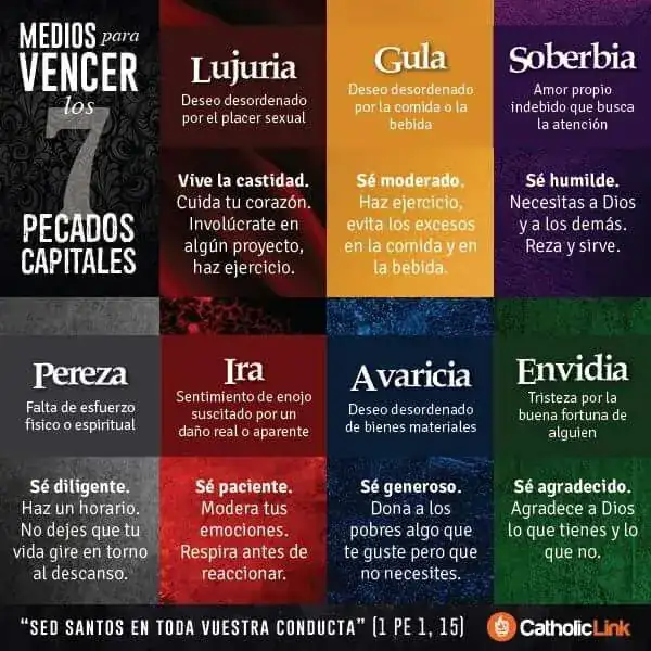 Soberbia, avaricia, lujuria, ira, gula, envidia y pereza.
