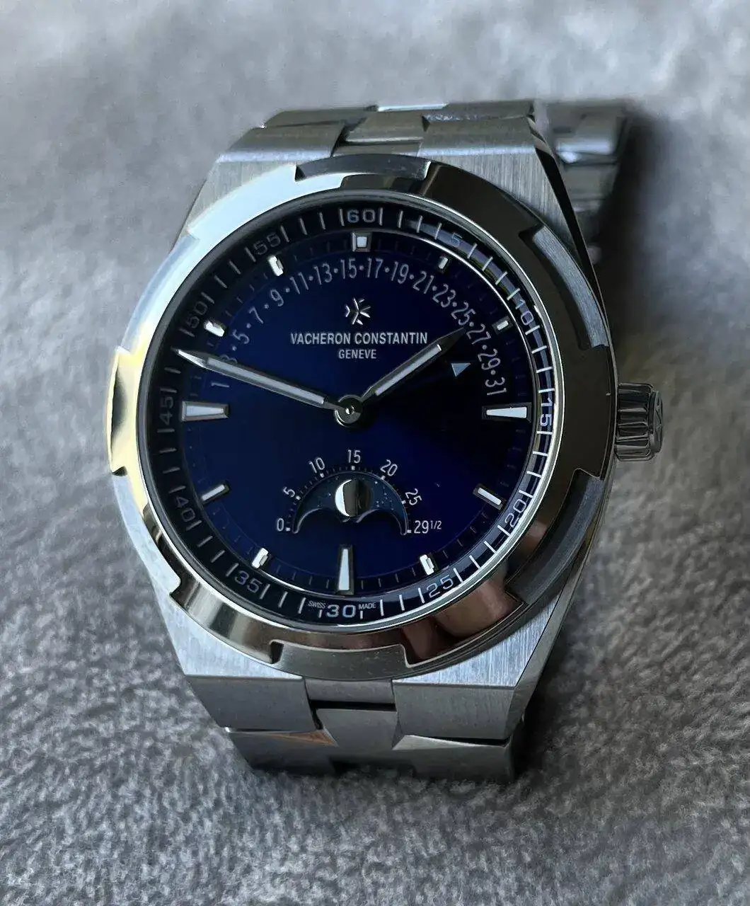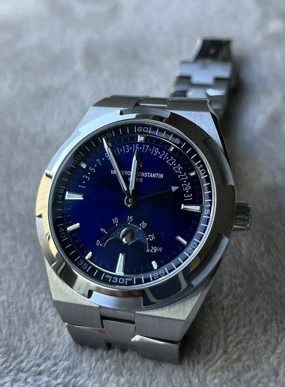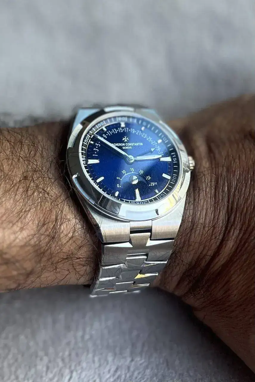 De un simple vistazo al dial azul mar profundo y a su característica caja de acero de 41 mm no queda ninguna duda de que estamos ante un Overseas. Pero también a primera vista se intuye que es algo más. Que tiene algo especial. Tiene todo lo que me gusta del Overseas pero además ofrece una fase lunar y una fecha retrograda ubicadas en la esfera presentando un balance visual cercano a la perfección.