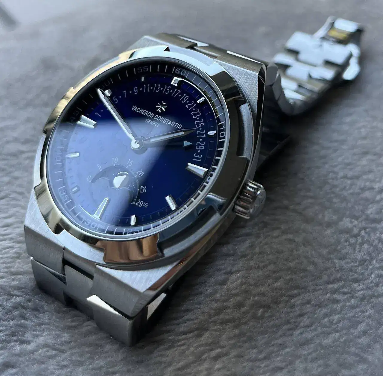 Como curiosidad, siendo la fecha retrograda una de las complicaciones fetiches de Vacheron, la cual ya aparece en sus colecciones desde hace más de 100 años, es la primera vez que se muestra en un Overseas. Parece difícil averiguar cómo se le ocurrió a alguien integrar estas complicaciones tan clásicas en un reloj moderno manteniendo a su vez su instinto totalmente deportivo. Pero por el resultado estético no pudo acertar más de pleno con este desafío. Estas complicaciones se sitúan sobre un dial lacado en azul, que se muestra exquisitamente difuminado dependiendo de la luz, dando la sensación de que las sombras de diferentes tonos azulados que se proyectan no podían haber sido elegidas mejor. Incluso la aguja de la fecha, según se mueve por la mitad superior del dial refleja a lo largo del mes, contrastando con los numerales e índices, diferentes tonos de azul según su ubicación.