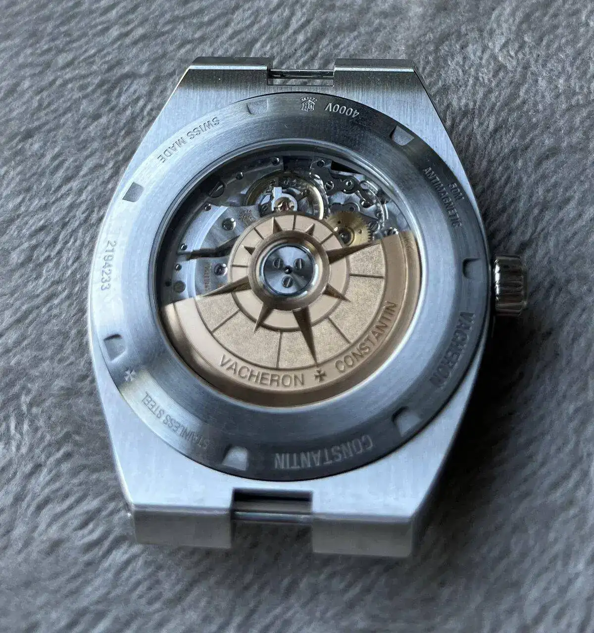 El reloj está equipado con un Calibre in-house automático que incluye la nada desdeñable cifra de 275 componentes. Ofrece una reserva de marcha de 40 horas y una resistencia al agua de 50 metros (suficiente para cualquier “accidente” en la piscina pero nada excepcional en este caso). El rotor central es como casi siempre con Vacheron su maravillosa rosa de los vientos en oro de 22K, con unos acabados magníficos y con el sello del Punzón de Ginebra como bandera de entrada. Pero lo que de verdad sorprende, y mucho, al conocer las características de este modelo es que el calibre con sus complicaciones se ha podido acomodar en la caja de 41mm del Overseas incluso reduciendo su grosor a 10,48mm en vez de los 11 mm del calibre tres agujas. Parece ser que tres años de investigación y desarrollo tienen la culpa de haberlo logrado. Dando si cabe una comodidad aún mayor al llevarlo que el modelo más simple de la colección.