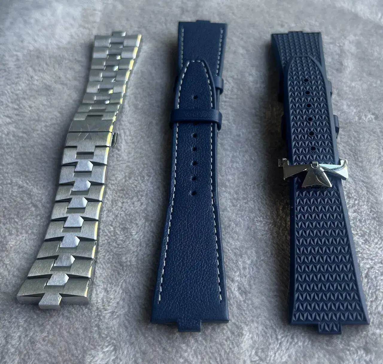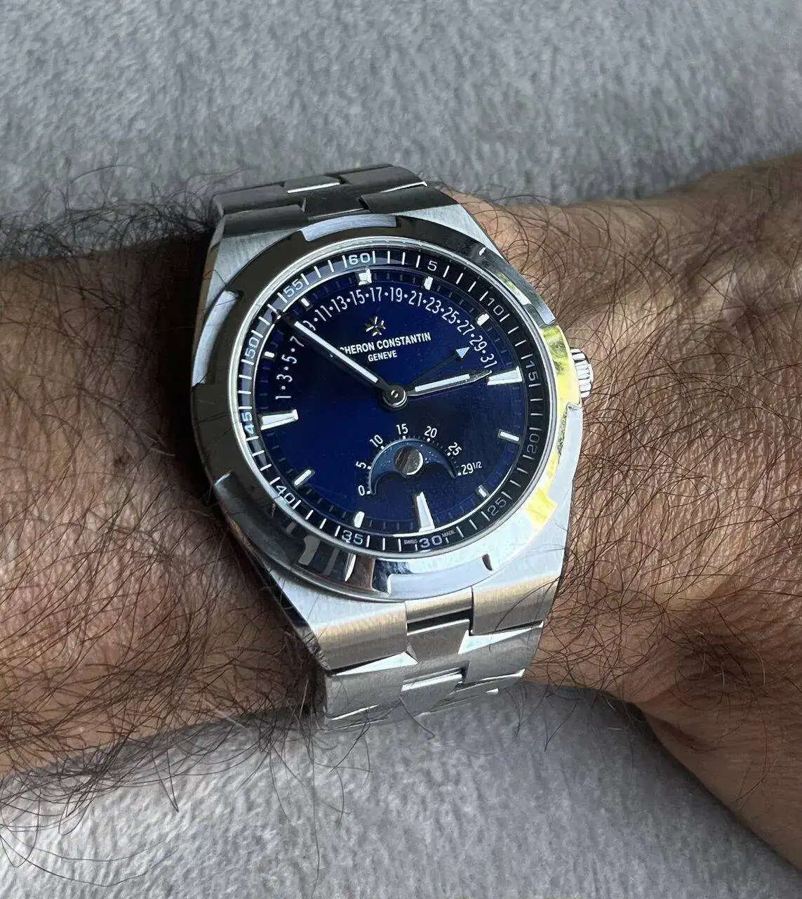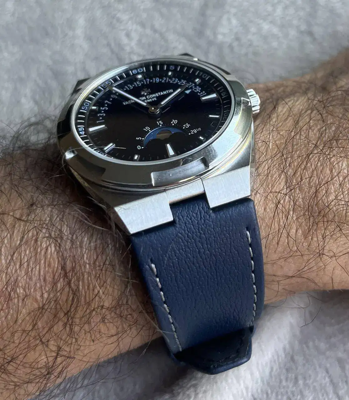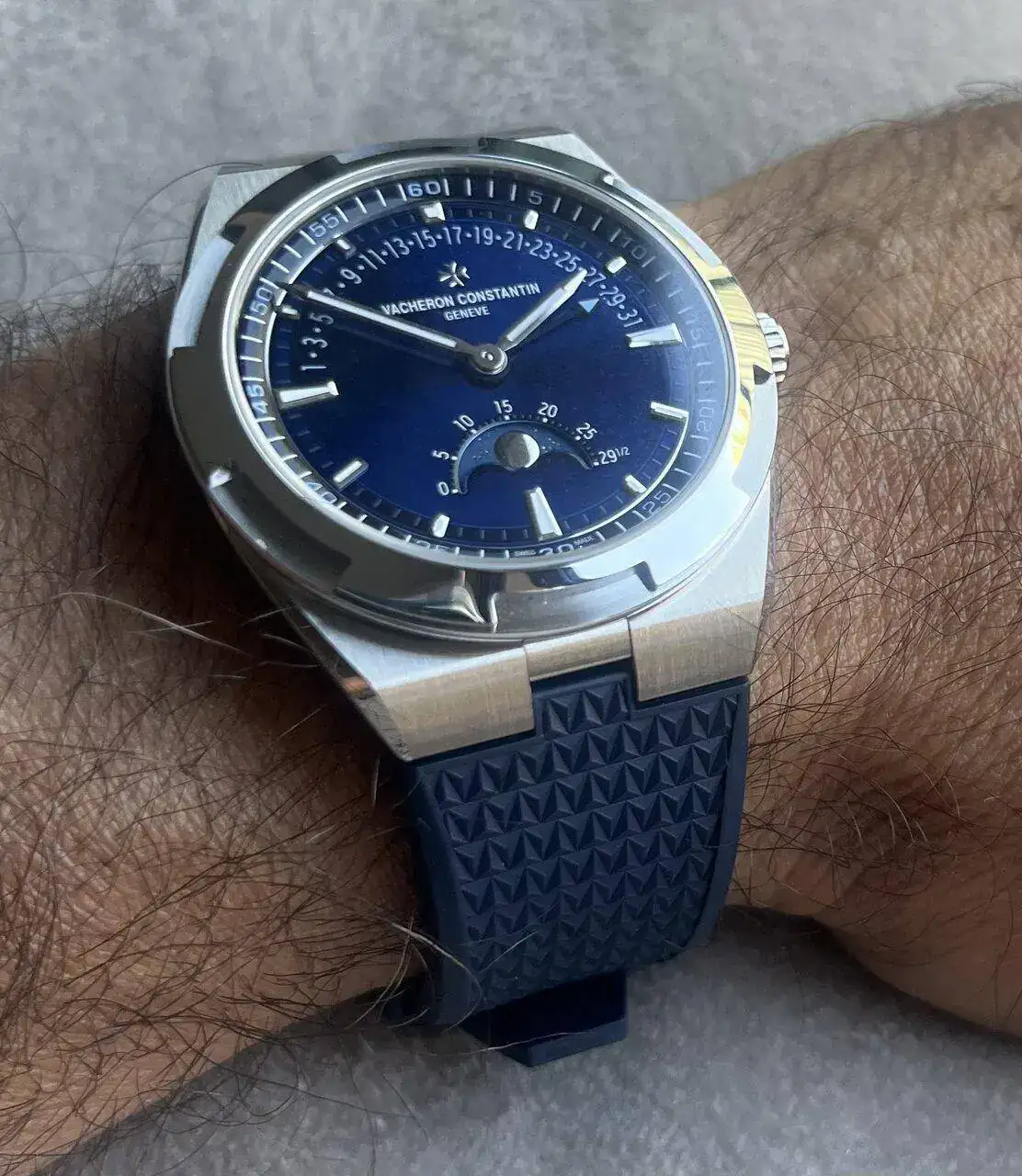 El reloj viene, como era de esperar en un Overseas, con su espectacular brazalete (para mí un top 3 como armis de cualquier reloj deportivo), y con dos correas azules adicionales en caucho y en cuero. Usualmente la correa de cuero en un reloj deportivo no tenía muchos adeptos, pero estoy seguro que en este modelo con estas complicaciones tan clásicas sí tendrá su tiempo de calidad en la muñeca durante el año.