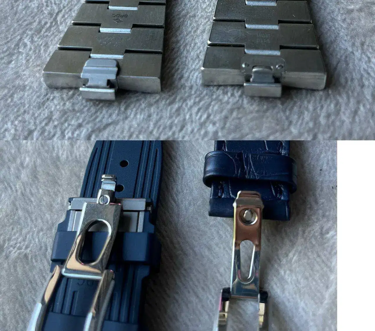 Por otro lado, el cambio rápido de correas, del cual Vacheron fue pionero, se ha mejorado sustancialmente su mecánica, siendo ahora superrápido. Manteniendo además a su vez la opción de poder usar sin ningún problema las correas y brazaletes antiguos que usaban la mecánica inicial (digno de agradecer por los clientes de Vacheron en este caso). Los contactos de las correas con la caja se han modificado para que no sea una pestaña metálica que se pudiera doblar con el uso repetido de intercambiar la correa en sí. Ahora es una especie de escalón mucho más robusto y práctico. A su vez el cierre metálico intercambiable de las correas de cuero y caucho se ha simplificado mucho su mecanismo de adaptación a una u otra correa. Dejo fotos de los mecanismos antiguos a la derecha y actuales a la izquierda, ya que me ha parecido digno de mención.