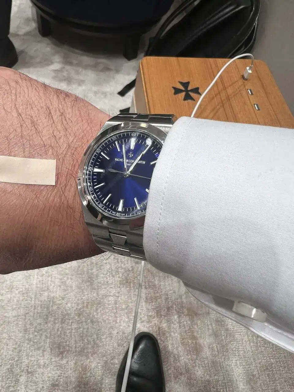Al volver de ese viaje y aprovechando que Rabat había abierto una boutique Vacheron en esas fechas, me dispuse a hacerles una visita y preguntarles posibilidades de este modelo. Para mi fortuna ese día justo estaba por la tienda Xana, la persona que habían hecho responsable precisamente de la boutique de Vacheron. Le comenté entretenidamente la experiencia raruna mía con los Overseas y me comentó que en cuanto llegara alguno me llamaba para al menos probármelo. Un par de semanas después, Vacheron trajo a esta boutique sus novedades a modo de muestra para el que quisiera probarse alguno. Yo ya estaba convencido del todo pero para quitarme el mono pues me dispuse simplemente a probármelo y tirar algunas fotos. Ahí ya descubrí las mejoras del cambio fácil de correa ó los contrastes del azul del dial cuando se mueve con la luz. Y bueno pues que para qué negarlo, lo bien que me quedaba: yo ya babeaba. Hace dos días llegó la primera unidad comercial a España. Apareció contra pronóstico porque la primera llegada estaba prevista como pronto para finales de año. Así que una agradable sorpresa del calendario. Mi agradecimiento público a Xana por permitirme tener acceso a su adquisición (servicio de venta extraordinario en esa boutique VC en particular, y en Rabat en general). Por mi parte no tardé ni medio segundo en decidirme y cerrar el asunto (un desastre…). En resumen, me he quitado alguna espina de encima que tenía clavada, el reloj me parece sencillamente colosal y además tiene muy buena pinta para disfrutarlo especialmente en verano con esos azules tan adecuados. Como casi siempre, el problema mayor es que el peligro lo tengo en casa. Mi mujer ya le ha echado el ojo…
