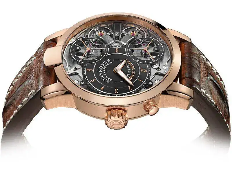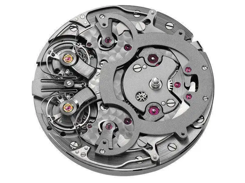Cuando se usa el reloj opera a 36000 vibraciones por hora y cuando se deja en reposo, a 8640 por hora. El reloj funciona con un barrilete y dos volantes reguladores alternativos. El de baja frecuencia usa una espiral muy fina y delicada y su utilidad consiste en mantener la cronometría durante los momentos de larga parada, que pueden llegar a dos meses. Supongo que el movimiento vendrá ajustado para que al dejarlo en reposo en una postura determinada, la desviación horaria sea mínima.