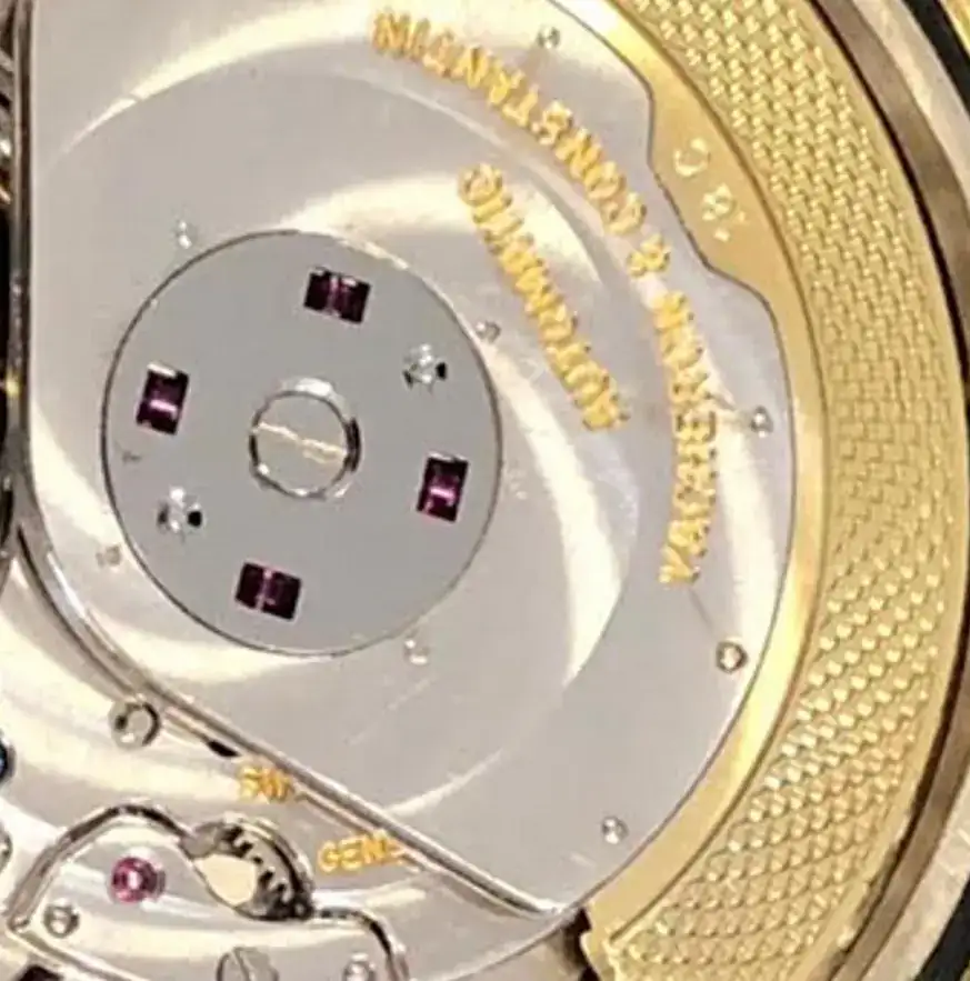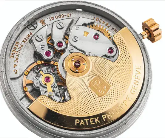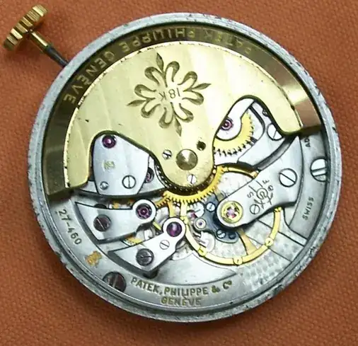 El movimiento tiene sus raíces en un calibre cuerda manual, típico de PP con puentes separados, el puente automático montado encima. Lo que se puede ver a primera vista es el rotor de oro guilloche, que gira a 360 grados en un cojinete de rubí. Lo que es una gozada para los ojos, también era un problema de este calibre. El enorme peso del rotor dañado el cojinete de rubio y otras partes del automático.