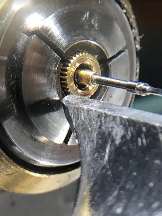 La corona es la original y mi amigo quería cambiarla y buscar una nueva, casi imposible de encontrar. El tema es, para cambiar la junta en la corona y tenerla bien limpia para una junta nueva, tienes que tornear y sacar todo de la ranura. Trabajo de chinos, pero la vieja junta no se va fácil y con la edad es más duro que madera.