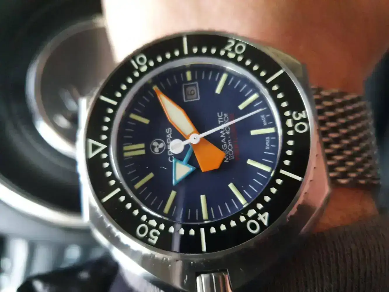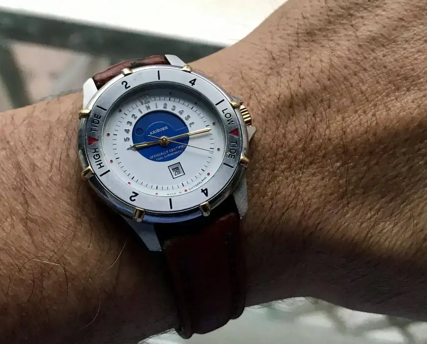 Un abuelete raruno. Kriëger Tidal Chronometer. Un americano suizo, COSC de cuarzo no termocompensado, con mecanismo ETA, concebido para controlar las mareas, (lunar), a finales de los 80. Zafiro, 100m y corona roscada en 35 mm.