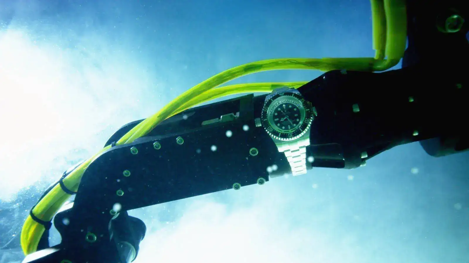 Se ven fotos en la red del Deepsea Challenghe sujeto al brazo robótico de un batiscafo, y sí que creo que ese reloj en concreto aguanta muchísimo, basta verlo; es una bestia de aspecto, medidas y peso superior al Invicta Hydromax, que ya es un reloj casi importable, pero no he encontrado ningún video probatorio de esa prueba de mar.