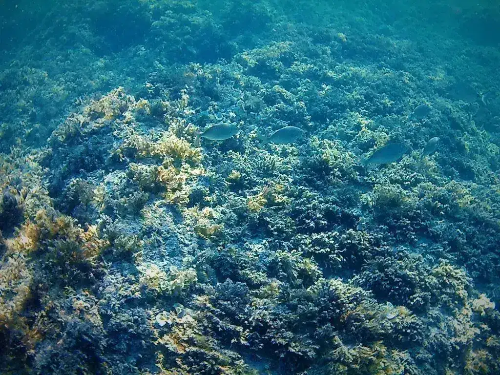 Aquí una perspectiva de la isla, donde hay una abrupta caída de profundidad, en muy poca distancia, de 1m a unos 8m, el cambio de temperatura y color del agua es más que notable.
