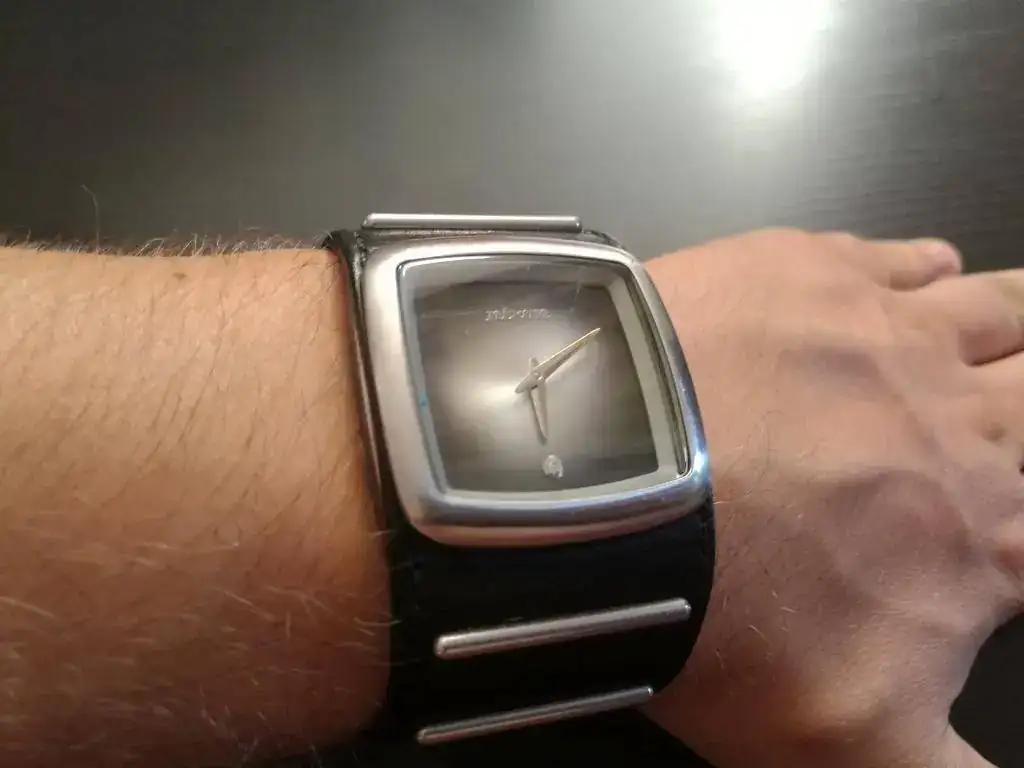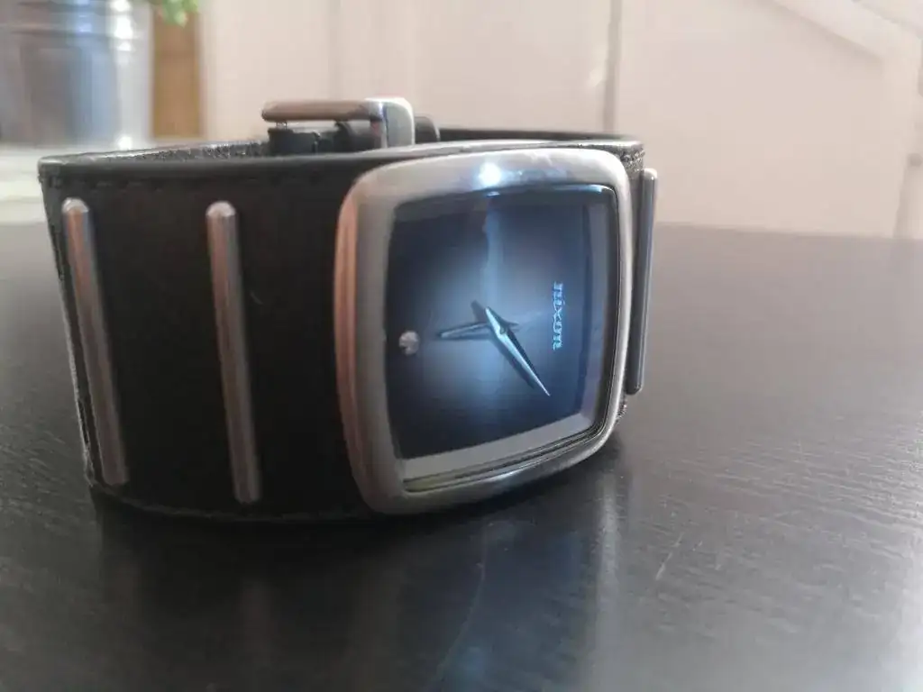 Nixon de cuarzo con correa integrada en piel y remates en metal. Se le acaba de cambiar la pila, por lo que funcionará un buen tiempo sin problema. Lo compré hace unos 12 años, pero ya no me lo pongo. Como curiosidad, lleva un pequeño diamante en su interior, a las 6h. Se podría decir que tiene un aire muy roquero.