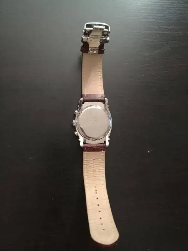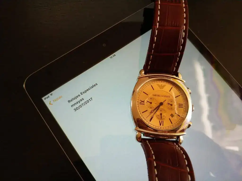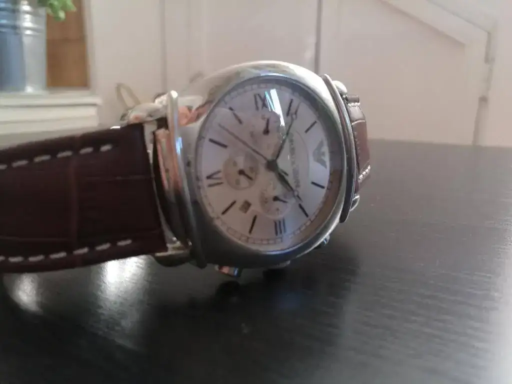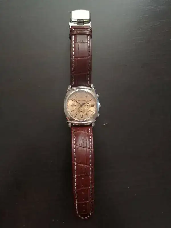 Reloj de la marca Emporio Armani, cuarzo, usado y con múltiples marcas de su uso. La correa (24mm) es de piel sin marca, Genuine Leather, a estrenar con su correspondiente cierre deployante. Dado su estado, lo considero perfecto para alguien que quiera trastear un poco con él, empezar con los cepillados y/o pulidos de caja, o simplemente le interese la correa. Destacar que los pulsadores no terminan de funcionar correctamente. No dispone de caja, garantía, papeles... Debe tener unos 10 años, ya que recuerdo la época cuando se compró.