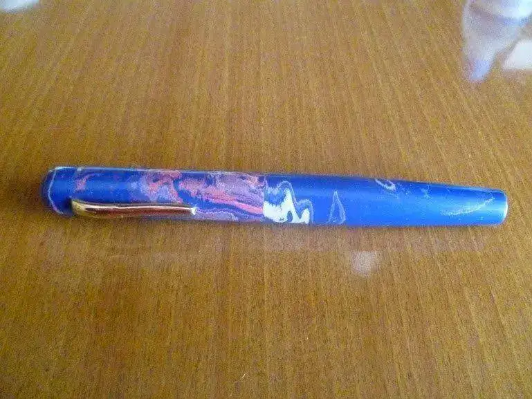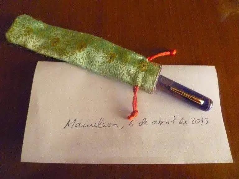 Estilográfica fabricada artesanalmente en La India, de ebonita y un tamaño muy considerable: 15 cm de longitud y ¡15,7 de diámetro máximo! La compré con la opción de plumín alemán, y escribe francamente bien, una grata sorpresa. Casi sin usar, está en perfecto estado. Incluye convertidor, y, dado que como eyedropper tengo entendido que da problemas a medida que se agota la tinta, entiendo que es la opción ideal de uso. Regalo funda que compré "ad hoc", fabricada en India también. Le pongo un precio de 40 Euros, gastos de envío aparte.