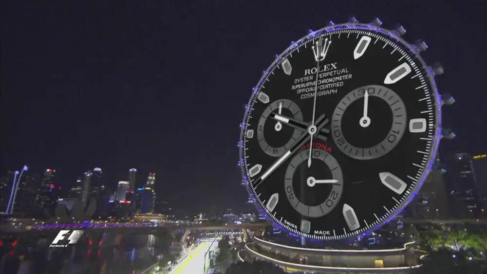 Eso es un anuncio "a lo grande". Y como saben que un GP de F1 es un gran escaparate... Pues hay que aprovechar. Justo en el GP de este pasado fin de semana, que se ha celebrado en un lugar donde las ventas de Rolex seguro que van viento en popa.