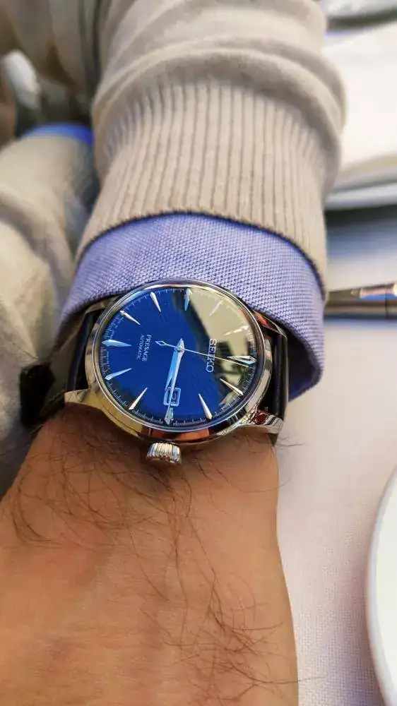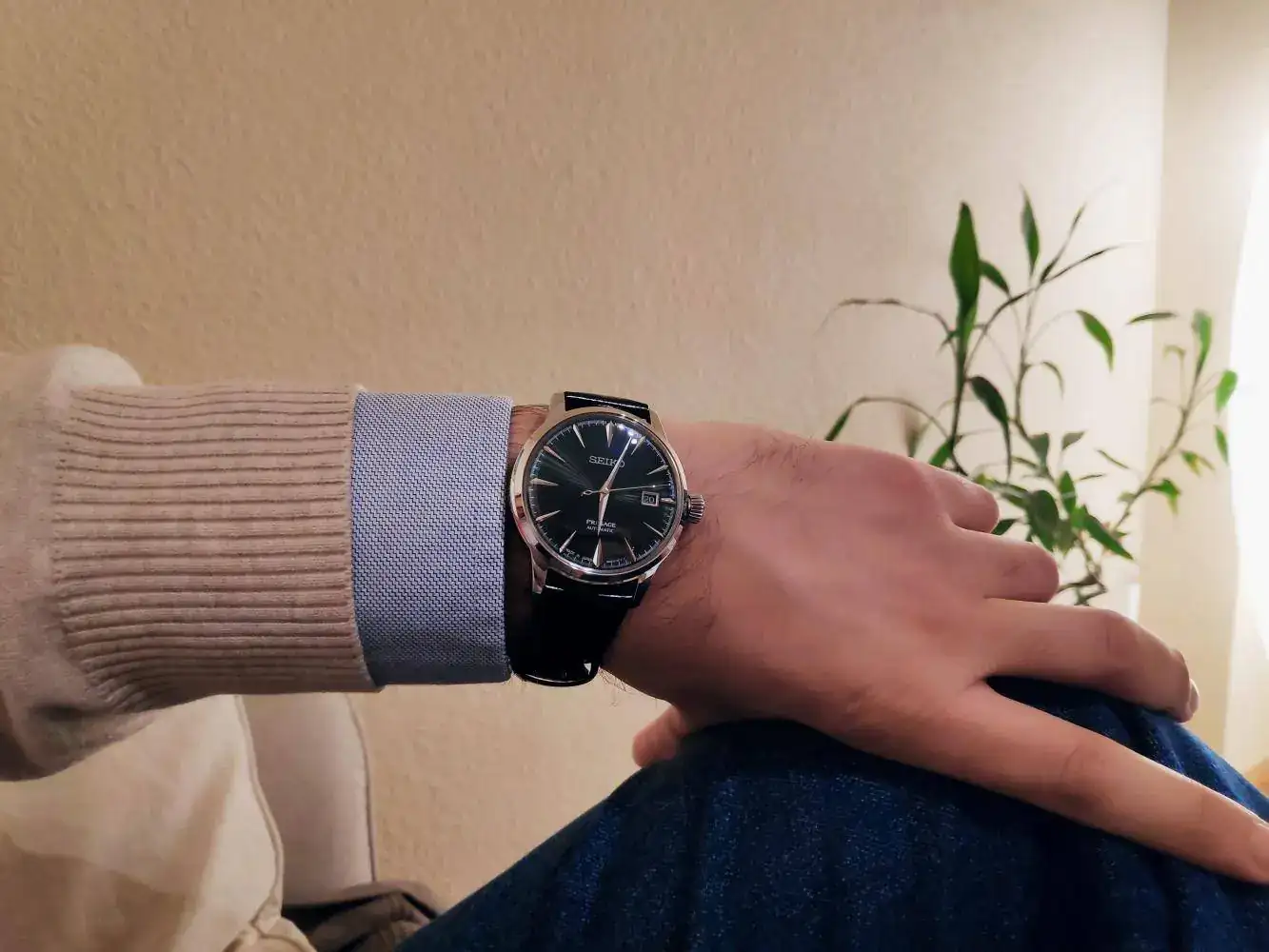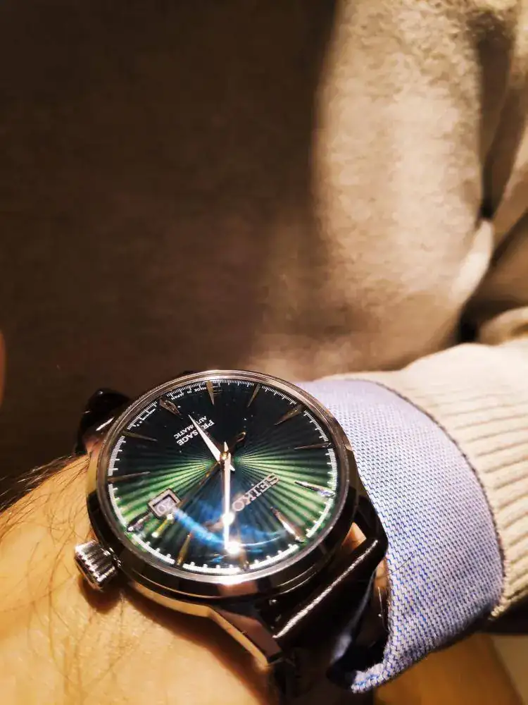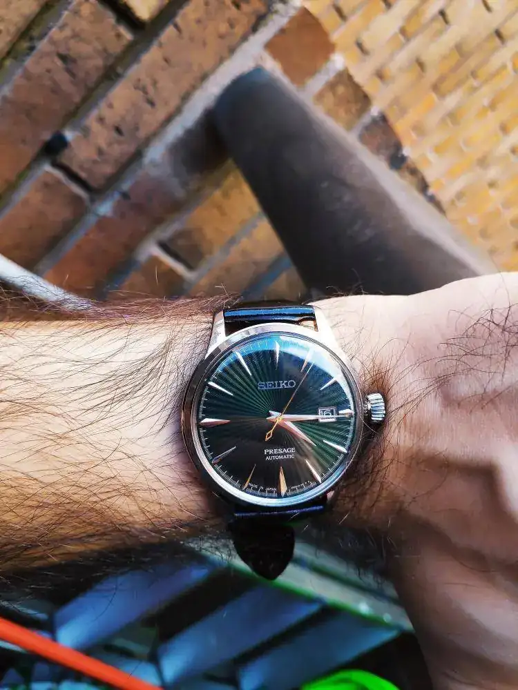 Todo un Seiko Presage Srpd37j1, como veréis tiene un dial de color verde muy bonito, en mi opinión muy vivo y mejor que otros de la misma marca, en cuanto le da la luz del sol o artificial cambia por completo, el dial puede transformarse en azul o negro dependiendo de cómo le incida la luz. Idéntico efecto le sucede a la aguja del segundero, de un color amarillo que varía muchísimo, es un reloj muy polifacético.