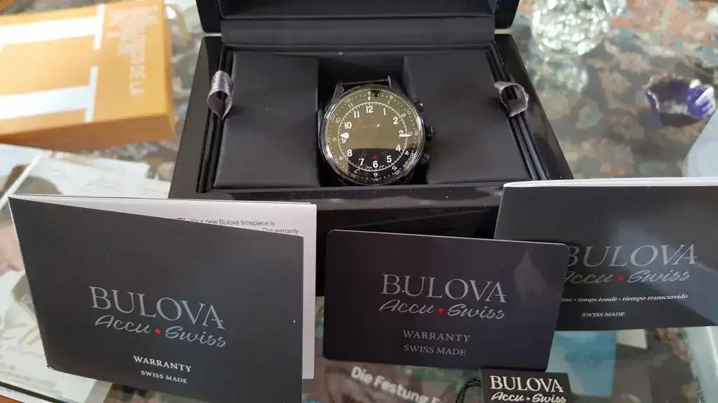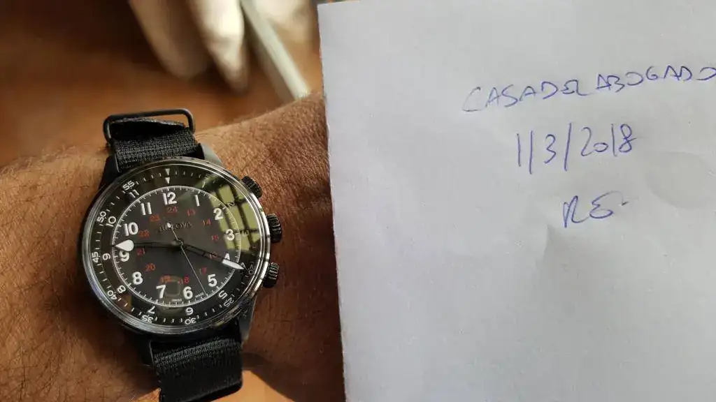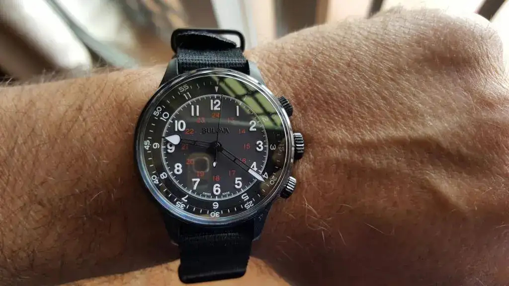 Este reloj es una reedicion de Bulova de un modelo pilot flieger que hicieron para la USAAF en la II GM. Usa los dos biseles moviles para calcular el tiempo transcurrido y mejorar la precision de los.bombarderos.