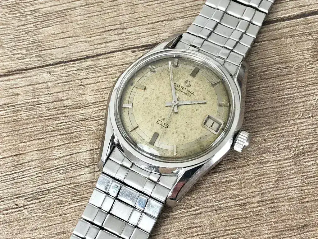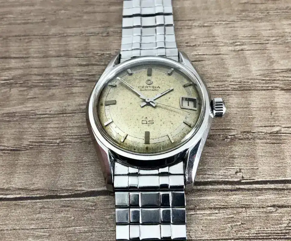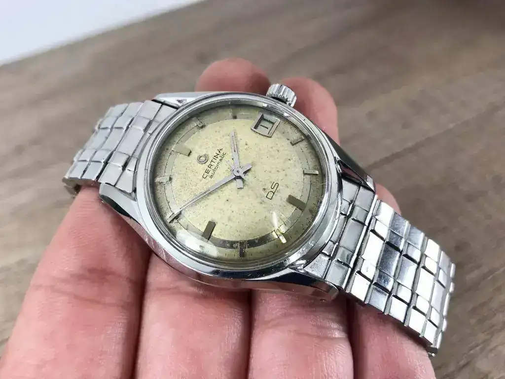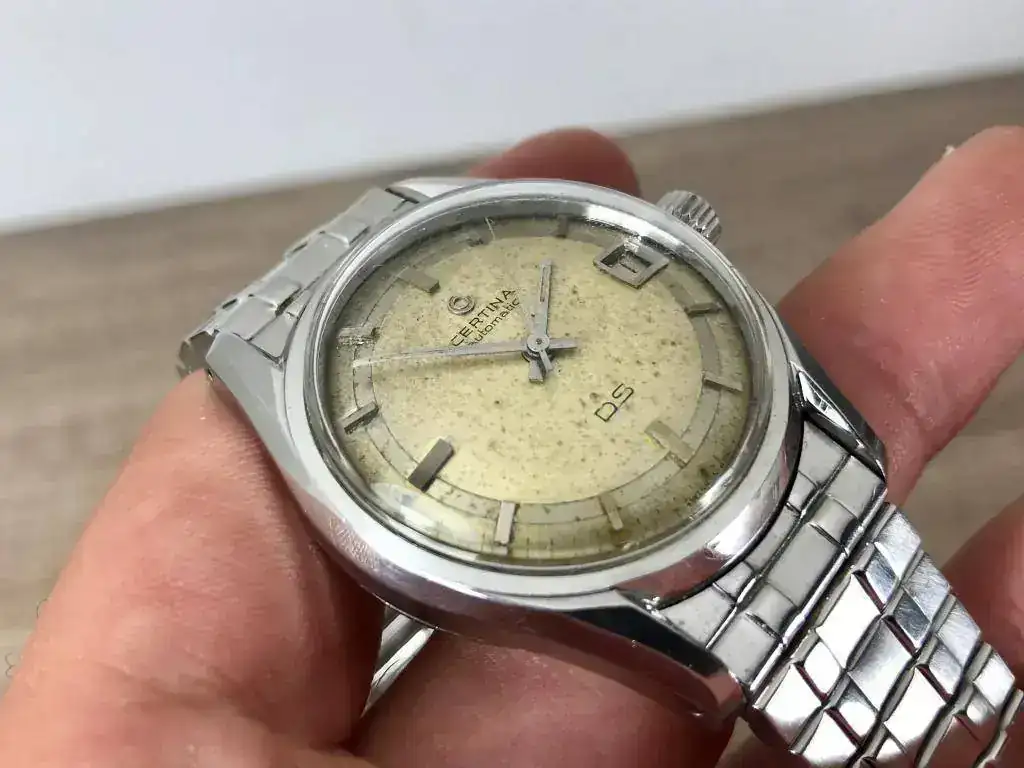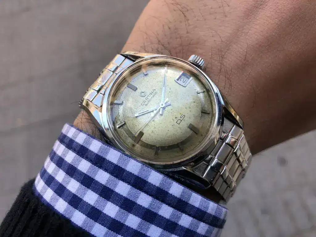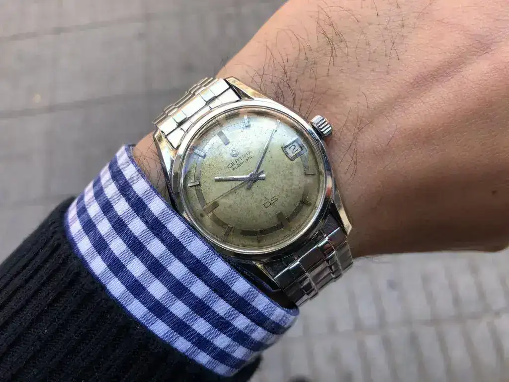 Se trata de un mítico, de sobra conocido por todos, uno de esos vintage que tienen mucha historia detrás. Un DS, mítico modelo de certina conocido por anunciarse como el reloj mas resistente del mundo. Este en concreto esta todo de serie y original, con todas sus piezas tal cual salió de fabrica. Las esferas de los DS y de la marca en general son conocidas por degradarse fácilmente. Esta tiene una patina verde que para mi gusto es espectacular, de echo lo compre principalmente por que me encanto la esfera y por estar todo de serie. También según tengo entendido es de los primeros modelos DS automáticos, con esa esfera y esos indices.