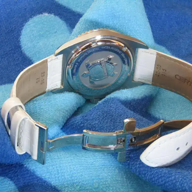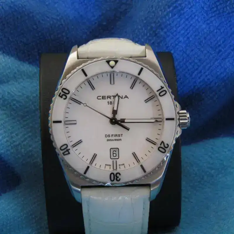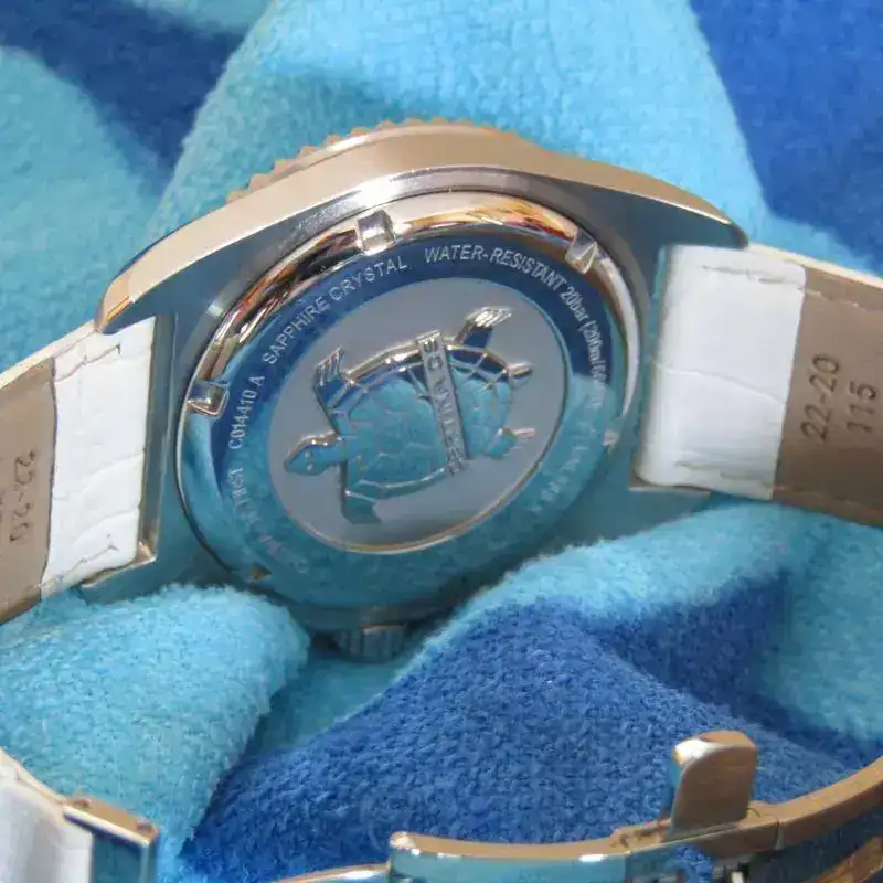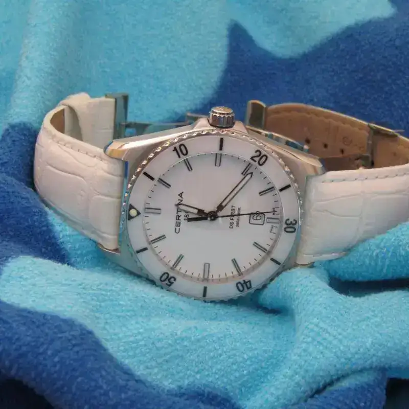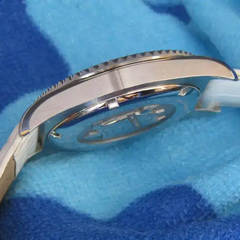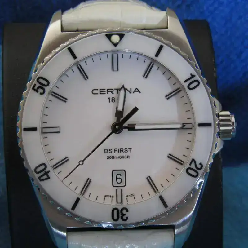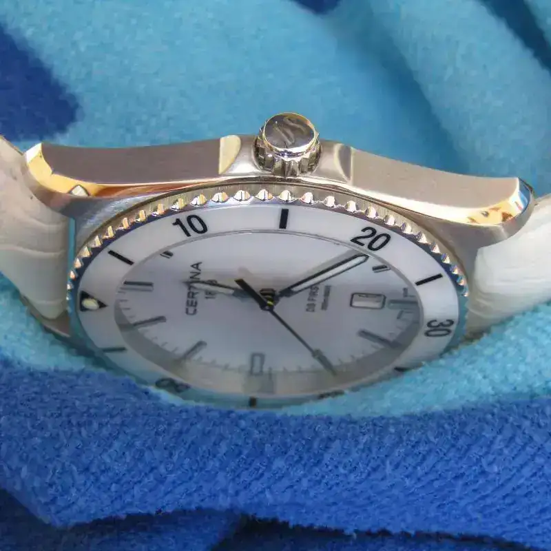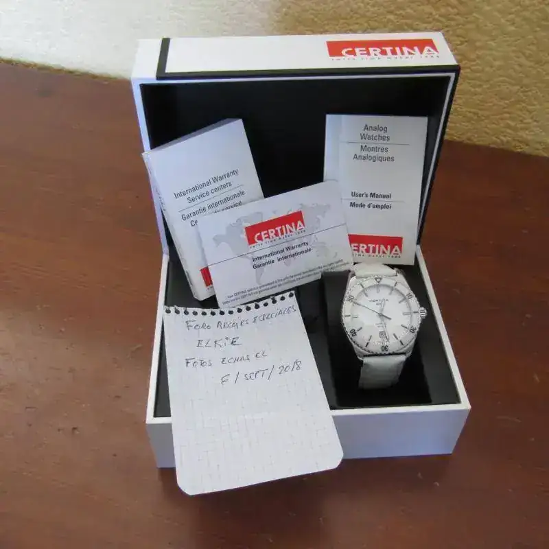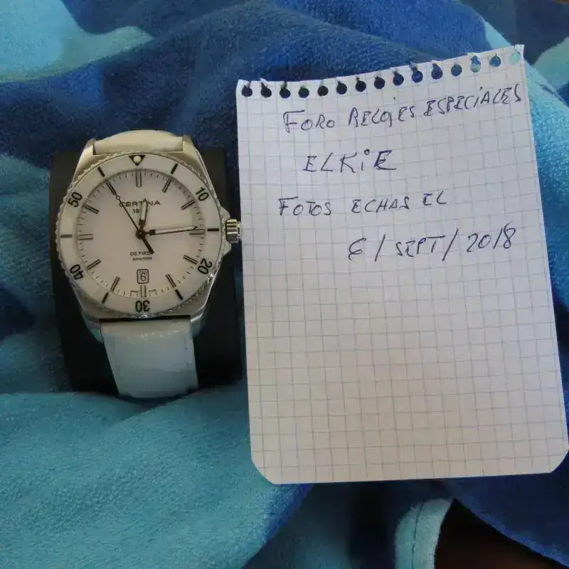 Hola a todos. Vendo este relojazo que me compré en uno de mis viajes de trabajo y que por una cosa u otra no he acabado de usar como se merece. Un reloj de verano, que luce un montón cuando estamos morenetes de tostarnos al sol y que no suele verse por ahí. Un diver, pero fino, de vestir, y diferente. Resistente al agua 20 atm y con su corona roscada. Bisel unidireccionál cerámico y un lumen mas que aceptable. El estado es de 10/10, si, no exagero, ni siquiera la correa de piel blanca esta ni sucia ni blanda por el uso. El reloj se habra puesto seis o siete veces maximo. No arañazos ni pelos por ningun sitio. Todo impoluto de reestreno. El reloj tiene todos sus papeles y garantia, sellada en la joyería austriaca donde lo compré. Cualquier duda o aclaración podeis hacermelo saber y os atenderé con mucho gusto. Un saludo.