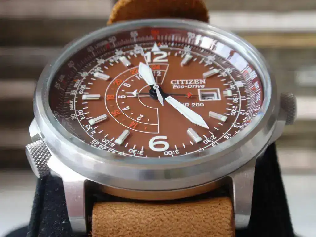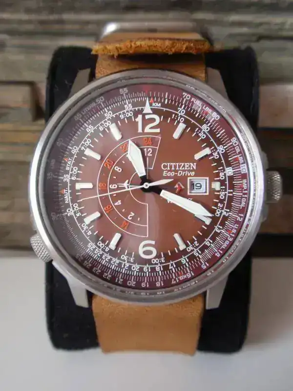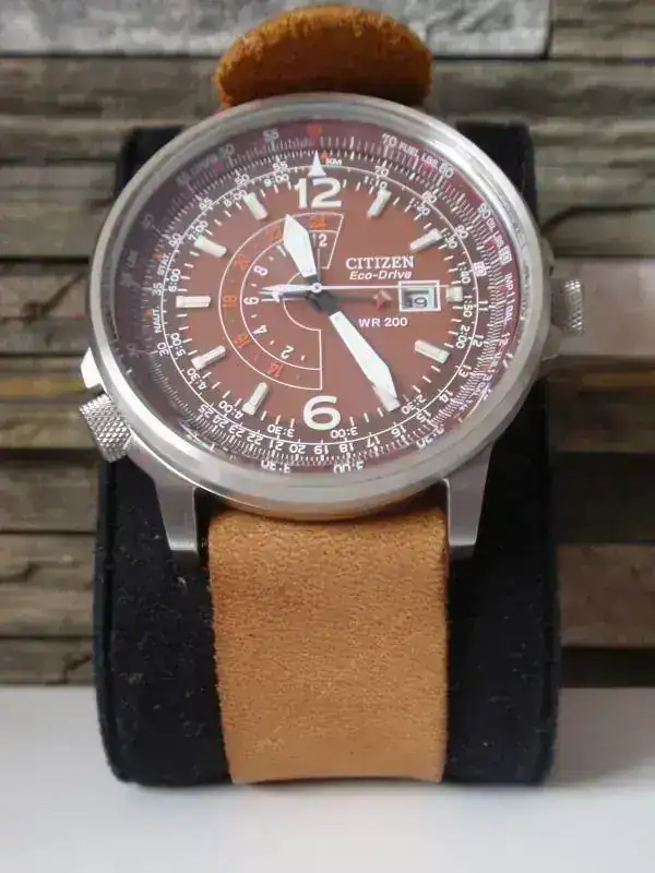 Es un Citizen Pilot Eco-Drive en acero 42mm, fondo y corona roscados, 200m, correa de cuero en muy buen estado con cierre desplegable y bisel interno con corona a las 8, además incluyo una nato que le queda muy bien. Su dial es realmente bonito.