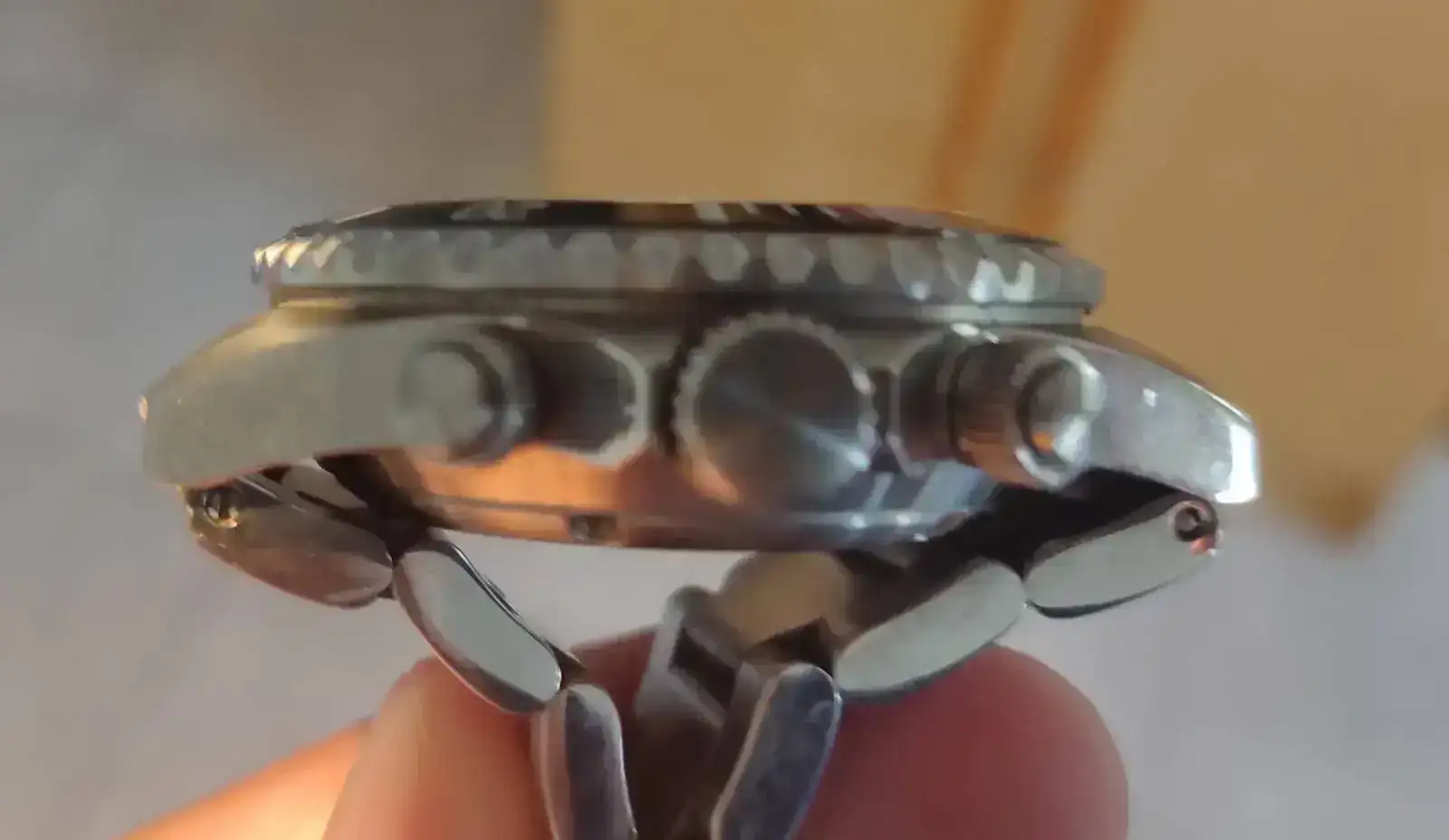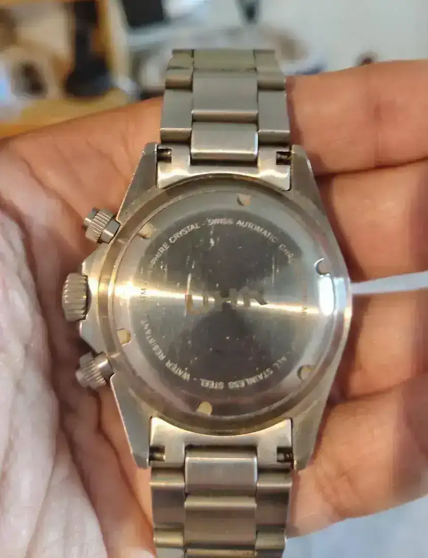 Caja: 43 mm , 22 mm entre asas. Tapa trasera y coronas( del crono y de la corona) roscadas. 200 metros de W.r.