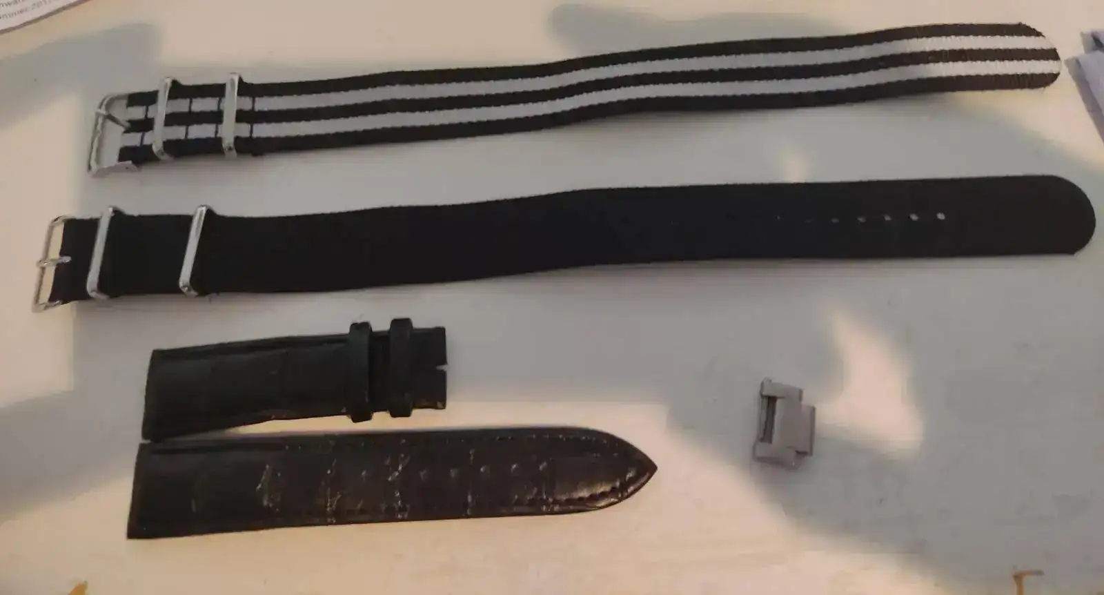 Brazalete: El armis original, con cierre desplegable de buceo. Como extras, un par de natos a juego con la esfera(negra y negra y blanca) y un cuero negro de reestreno.