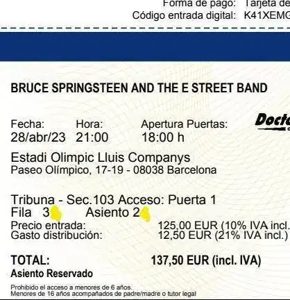 Vendo una entrada para el concierto de Bruce en Barcelona el 28 de Abril que me sobra. La entrada es de categoría P1, las más caras, bien situada en grada baja, centro del estadio, sector 103. Se vende al precio de coste 137.50 euros