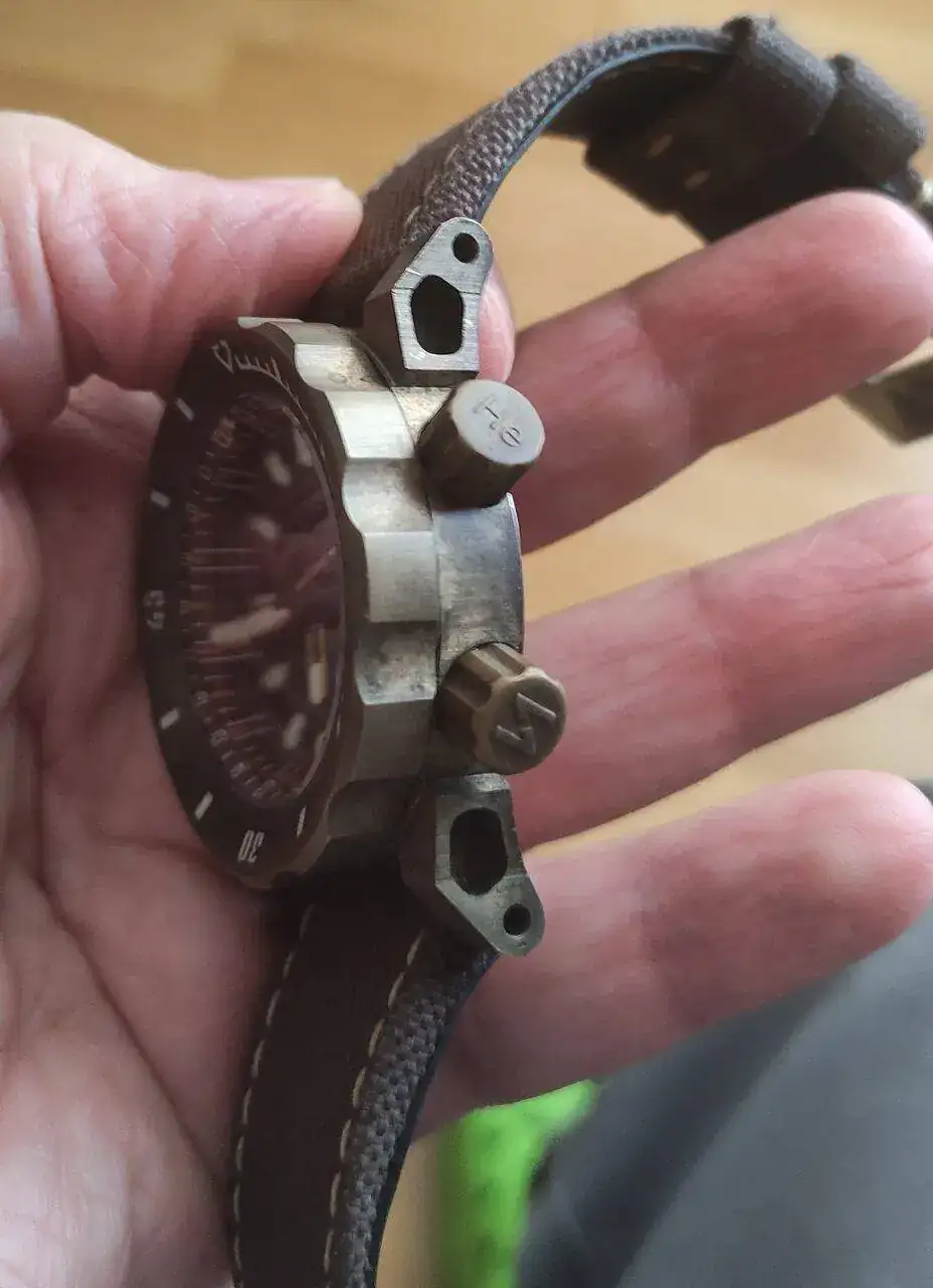 Mi unidad es la 64, caja de bronce en aleación de aluminio que nunca se pone verde, profundidad 1000 m y robusto reloj herramienta en su concepción. De los dos diseños de su tapa trasera escogí el del faro con la ola violentamente estrellándose contra él, pues para mí era el espíritu de las galernas del Cantábrico. Como soy meticuloso hasta la saciedad no paré hasta que mi unidad fuera perfecta de marcha. Está posteado en el hilo correspondiente pues le dediqué muchas horas a calcular su marcha con el cronocomparador. Por lo tanto tiene una marcha perfecta, en parámetros COSC y fiabilidad absoluta del magnífico calibre suizo Eterna 3945A que lleva fecha y función GMT que siempre me había gustado. Leed los hilos posteados con su fecha. Como nota de su fiabilidad, soy piloto y ha cronometrado diversos vuelos sin problema. Está usado como veis en las fotos, ciertamente cuando llegó no me lo podía sacar de la muñeca pues impacta y el efecto lupa de su lente me absorbía literalmente. Veréis la patina que se forma lentamente, a unos les apasiona, a otros no tanto. Hay un hilo donde explica cómo retirarla y queda como las fotos del mismo que publiqué al recibirlo. Ciertamente el matizado que adquiere le viene muy bien. La correa es la original del maestro Jacobo, usada pero perfecta, sumergible y es un placer ver cómo se seca sin problemas y rápidamente.