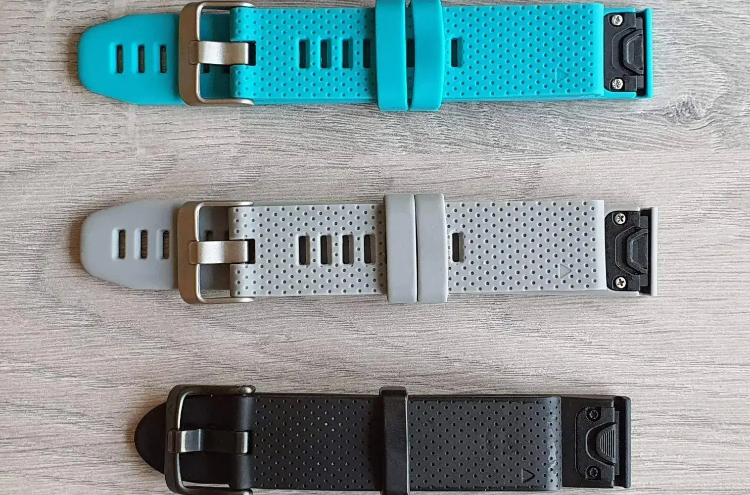 Brazaletes: 2 de caucho originales Garmin (color flúor y color negro) + 2 de caucho compatibles (color azul agua marina + color gris).