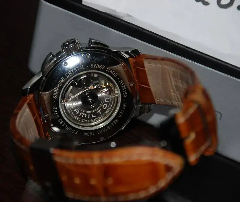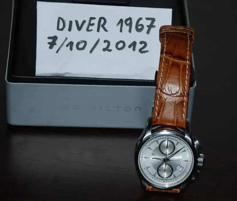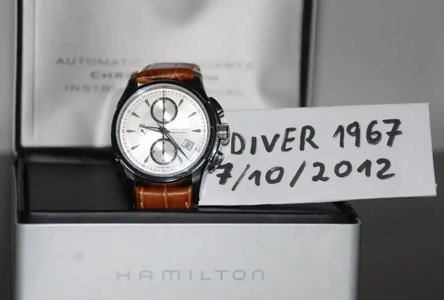 Pues nada que voy a reducir un poquillo la colección.En esta ocasión le toca a mi Hamilton Jazzmaster crono.Está en muy buen estado de uso como veréis en las fotos siguientes.Si tiene algo son pequeñas micro-rayas de uso muy civilizado.La correa está al 85% tirando a lo bajo.Tiene toda la dotación completa caja exterior,interior de aluminio,papeles y garantía ya vencida de 2009.