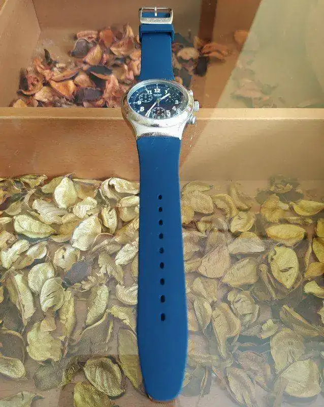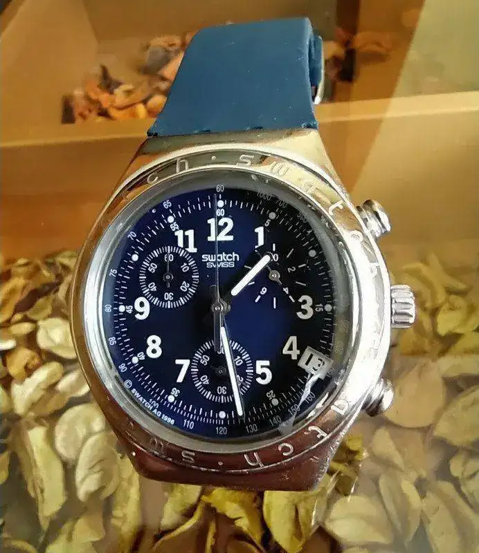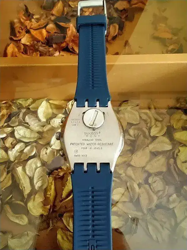 con corona escondida en la trasera este presenta algunas señales en el cristal solo se ven al trasluz funcionando perfectamente y este bonito cronógrafo Swatch en un azul precioso va con una correa de goma o caucho no tengo ni la caja ni los papeles.