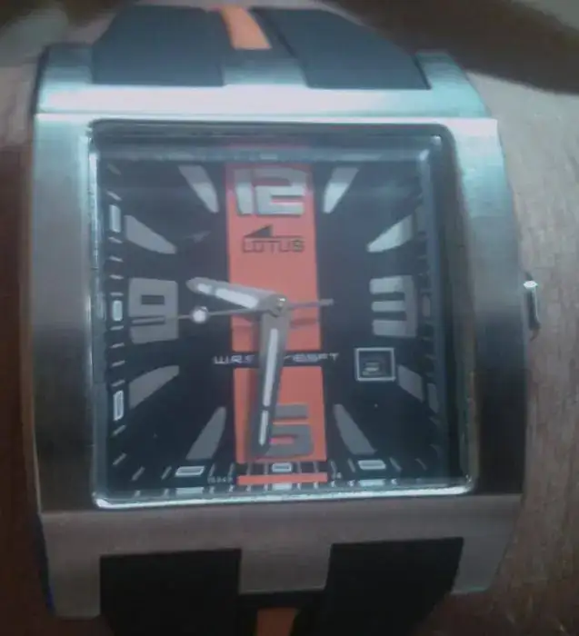 El reloj tiene una caja de acero cuadrada,con 43 mm de ancho,corona incluida.Corona firmada.Tapa trasera atornillada y con el logo de la marca.