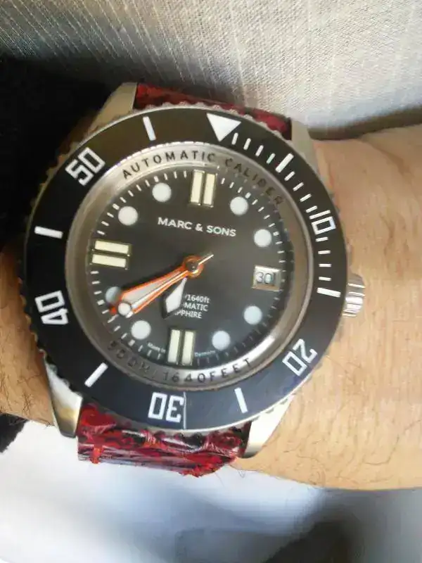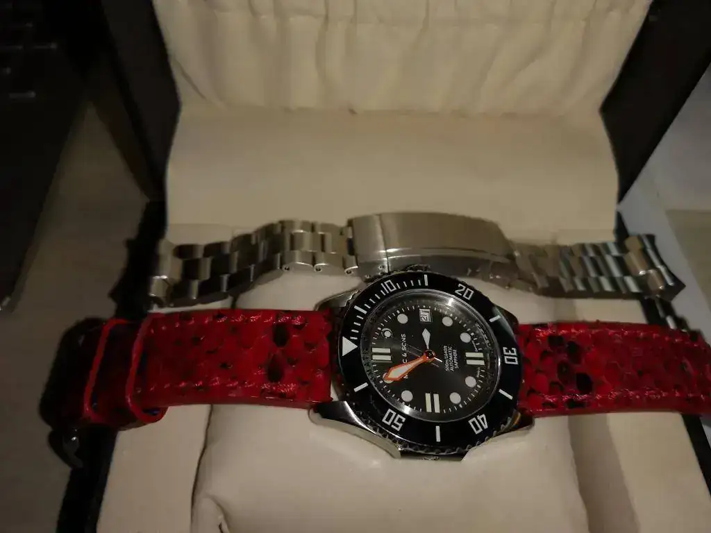 Se vende con una correa de cuero de Mansarea roja con piel de serpiente. O su precio baja a 275 euros si solo va con el armis.