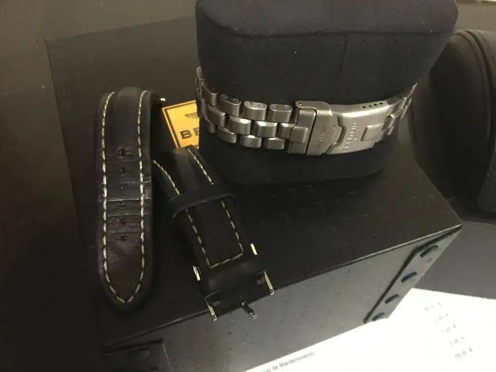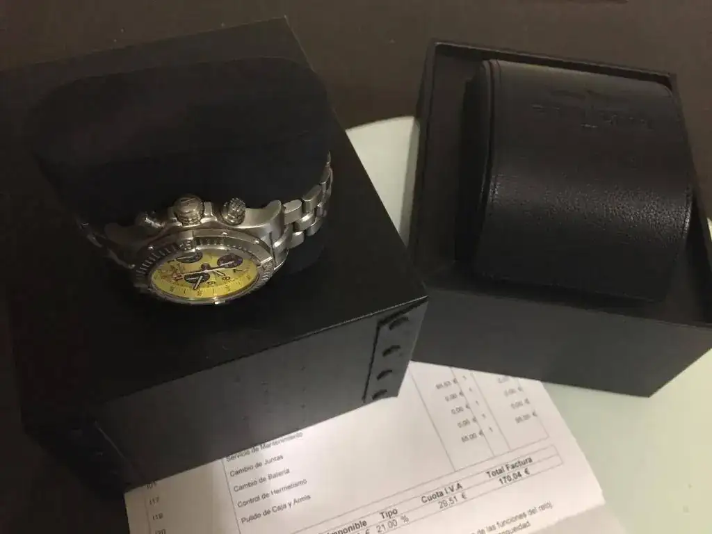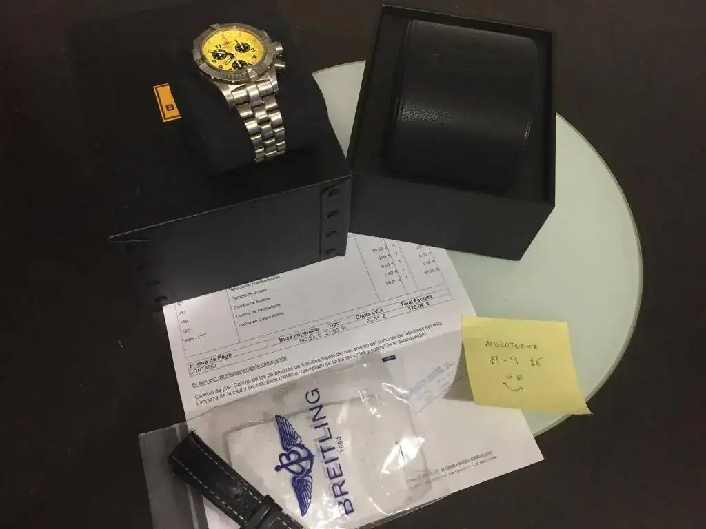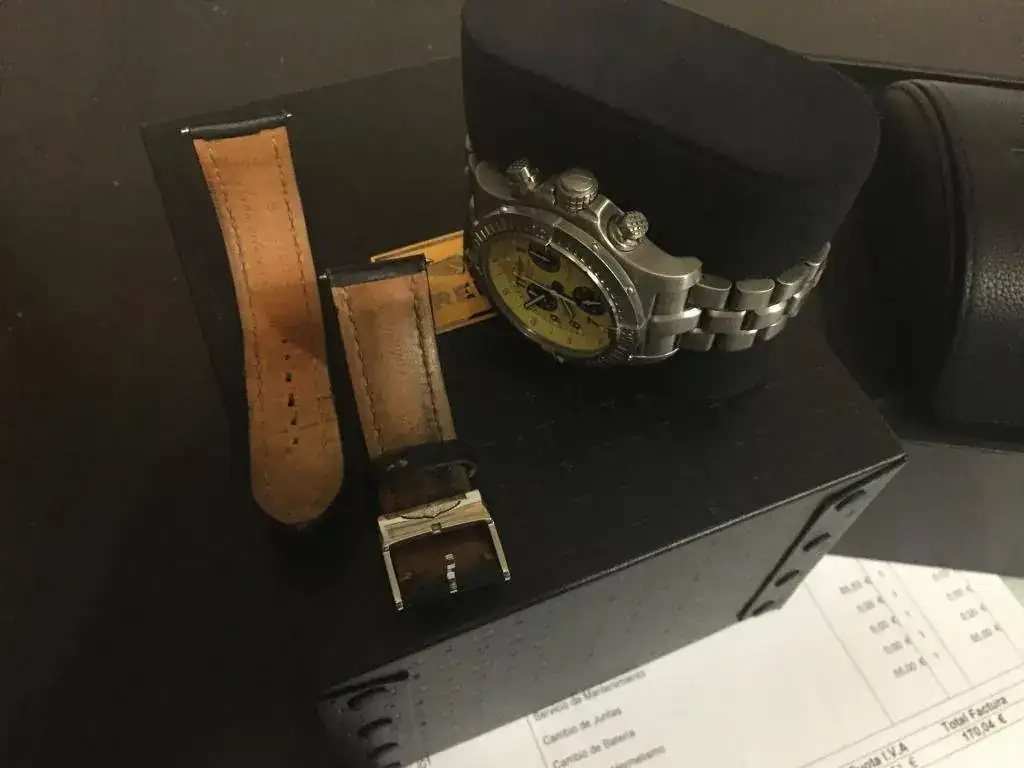 Pongo fotos para que se vea bien, tiene alguna marca, pero esta recién pasada la revisión en servicio oficial Breitling Madrid, calle cabanilles. Con un gran descuento en el servicio al ser un cliente conocido. Incluyo la factura.