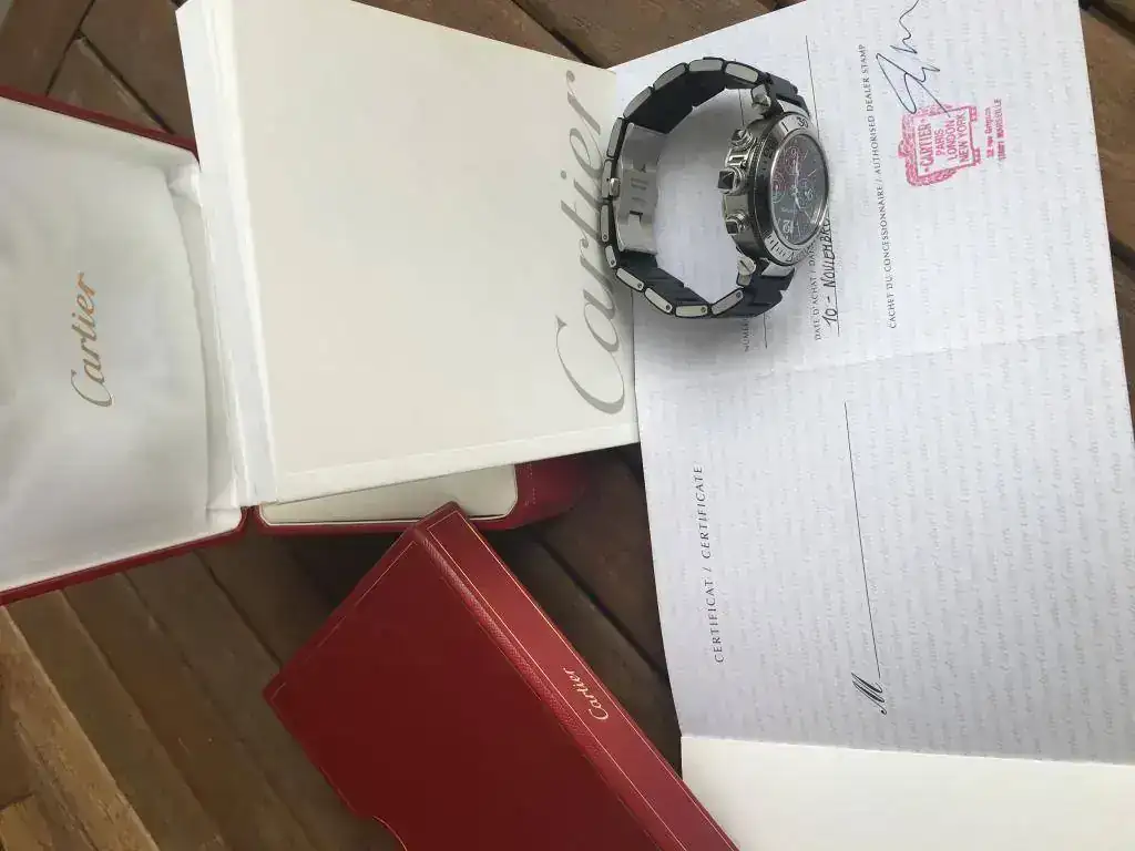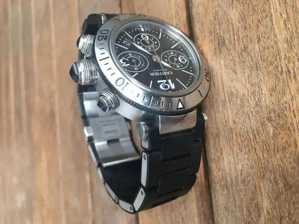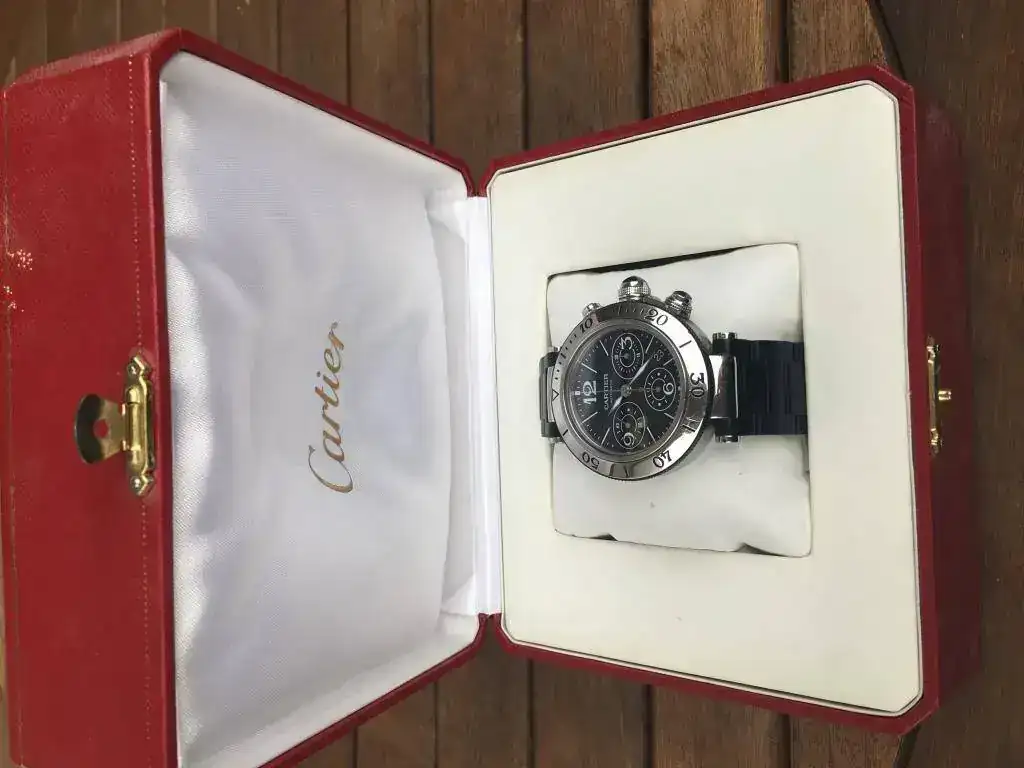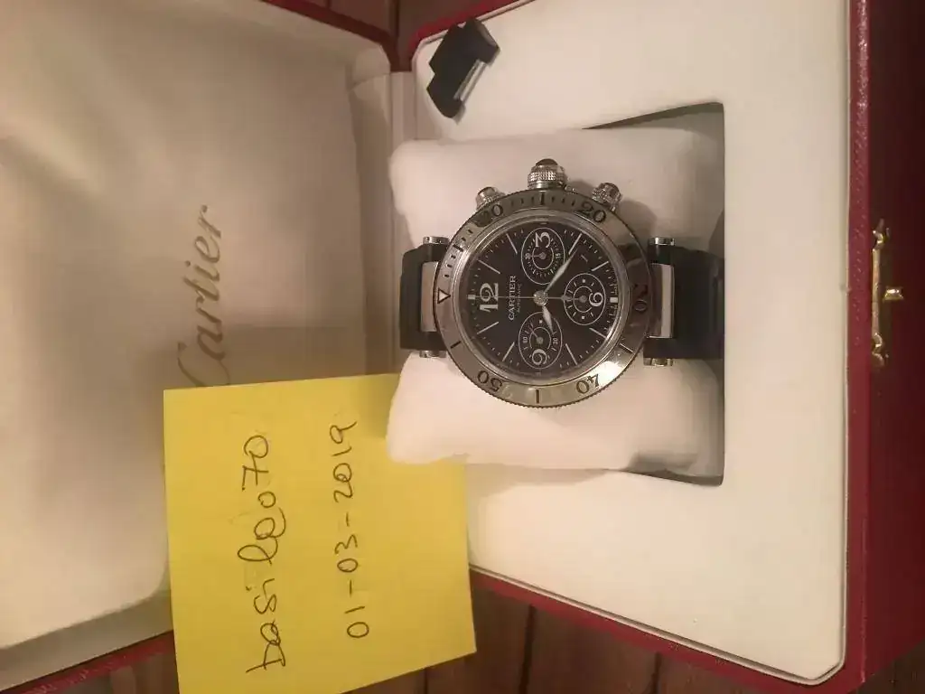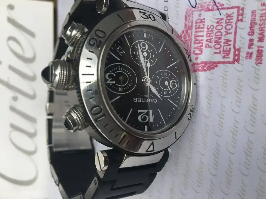 Saco para venta o cambio este Cartier Pasha Seatimer Chrono de 42 mm en buen estado tanto estético como de marcha, nunca pulido y con poco uso, al usarlo en combinación con otros relojes. Tiene números arábigos a las 3, 6, 9 y 12 horas; 3 subesferas, mostrando el cronógrafo 60 segundos, 30 minutos y 12 horas. Bisel en acero giratorio unidirectional y resistente al agua a 100 metros/330 pies. Preferible entrega en mano.