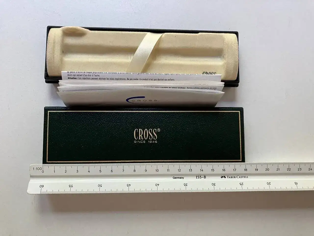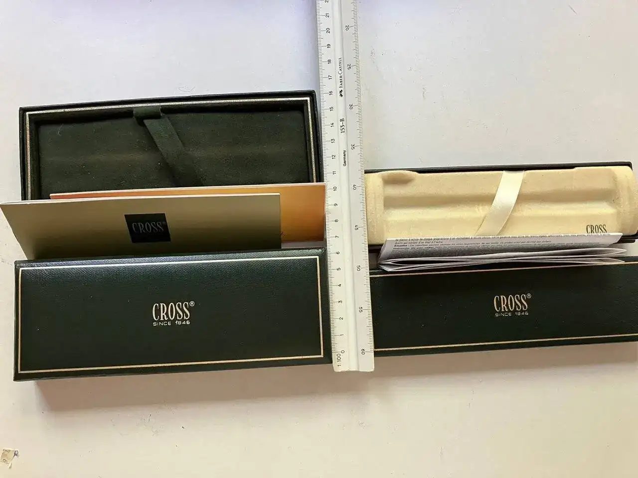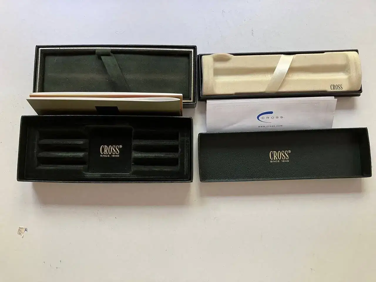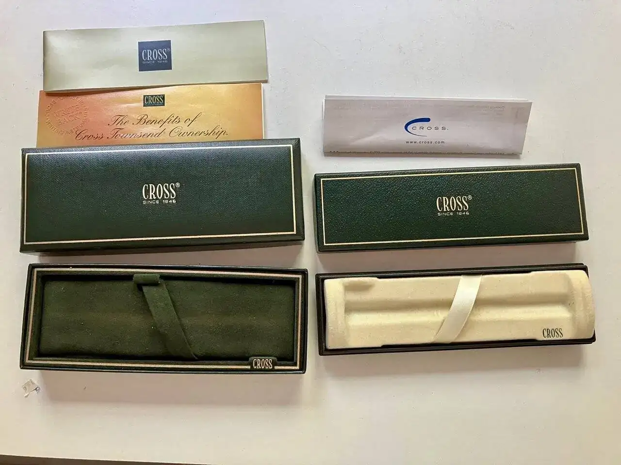 Vendo un par de estuches de escritura CROSS en buenas condiciones que tengo por casa desocupados (deben ser más o menos de finales de los 90 o principios de 2000). Además de los estuches cada uno de ellos tiene, como se puede ver en las fotos, cierta documentación.