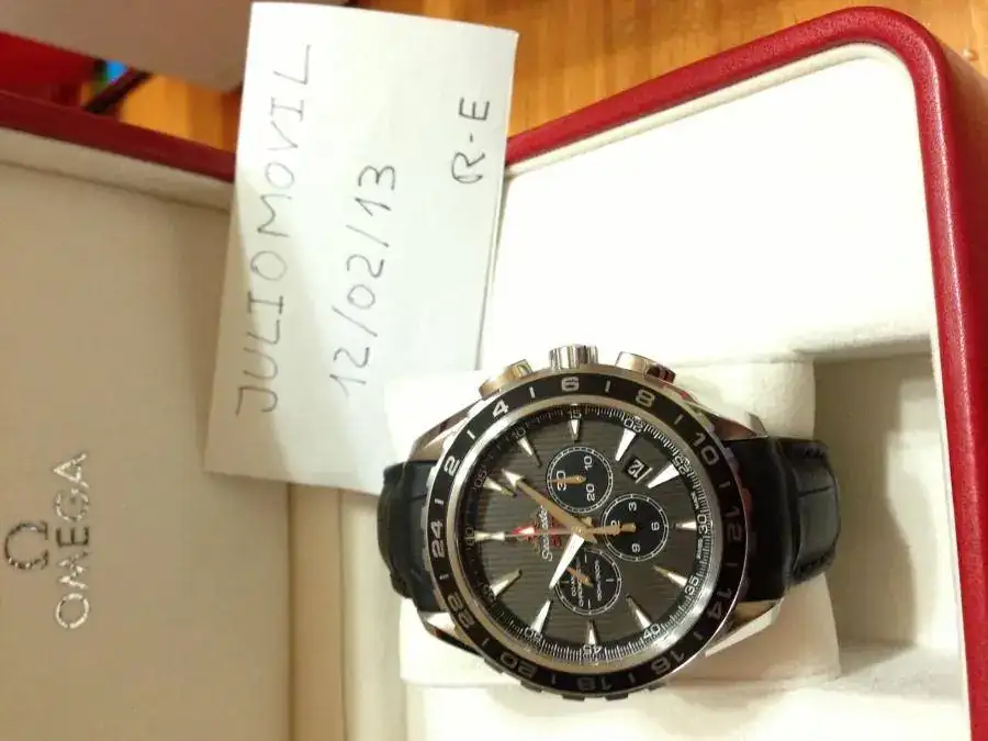 Movimiento: Cronógrafo Automático Omega 3603 con Certificado de Cronómetro (COSC). GMT 2.º huso horario, mediante aguja de 24 horas. Totalizadores de 12 horas y 30 minutos.