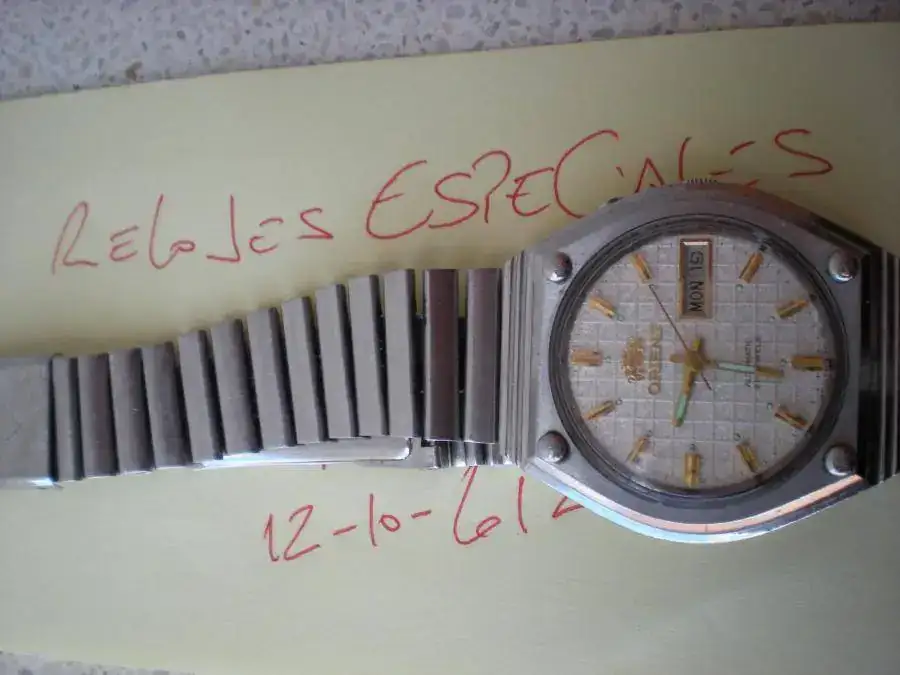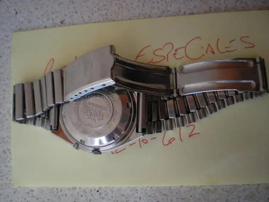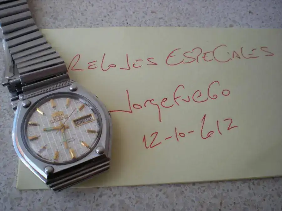 Bueno compañeros pues aquí pongo este Oritent con mas que solera yo diría que con unos 30 años de antigüedad mas o menos ,el reloj fue comprado con la intención de ponerlo a punto ya que no va demasiado fino pero al final no lo hice, eso si mantiene la marcha perfectamente y tiene reserva de la misma ,pero aunque no atrasa ni adelanta mas que unos 5 o 6 sg día (ahí están) así mismo el día de la semana no avanza ,imagino que con una puesta apunto seria suficiente ,las características son las siguientes: