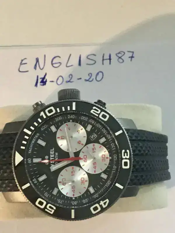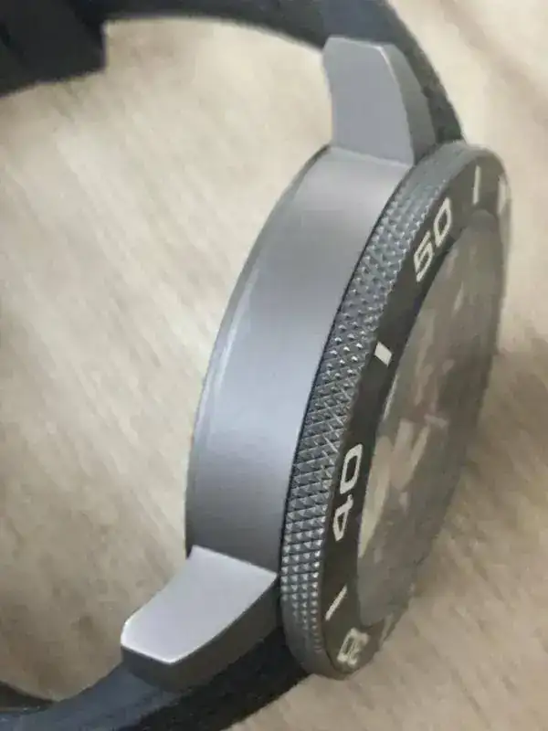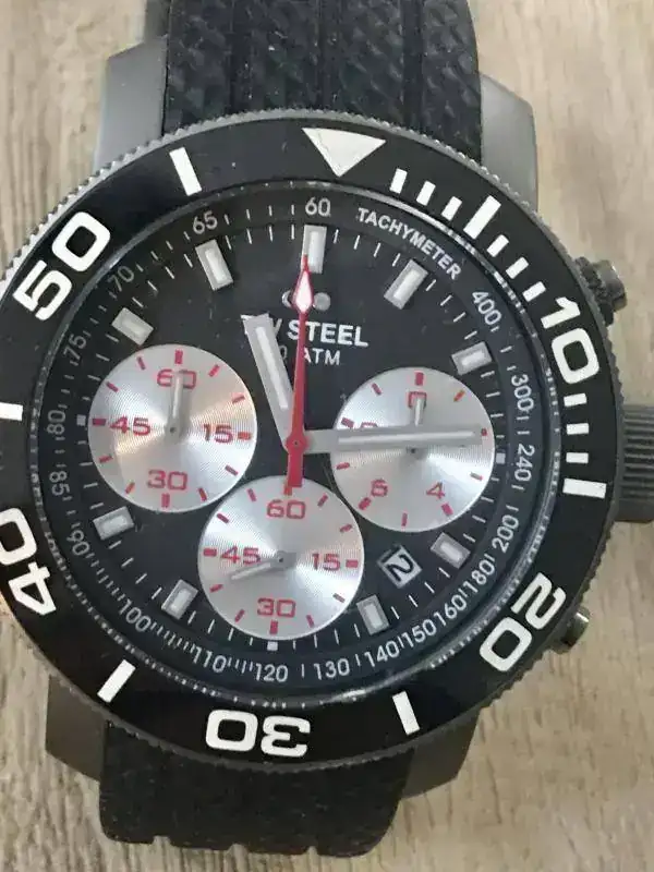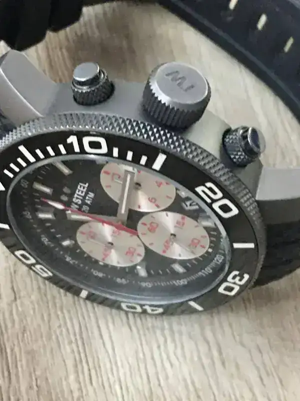 Su tamaño es de 45 m, tiene roscadas tanto la corona como los pulsadores de los subdiales, revestimiento de titanio oscuro, correa de silicona con tratamiento antipolvo, Bisel unidireccional cerámico, cristal endurecido, taquímetro, 20 AT, tres subdiales Plata, movimiento suizo de cuarzo.