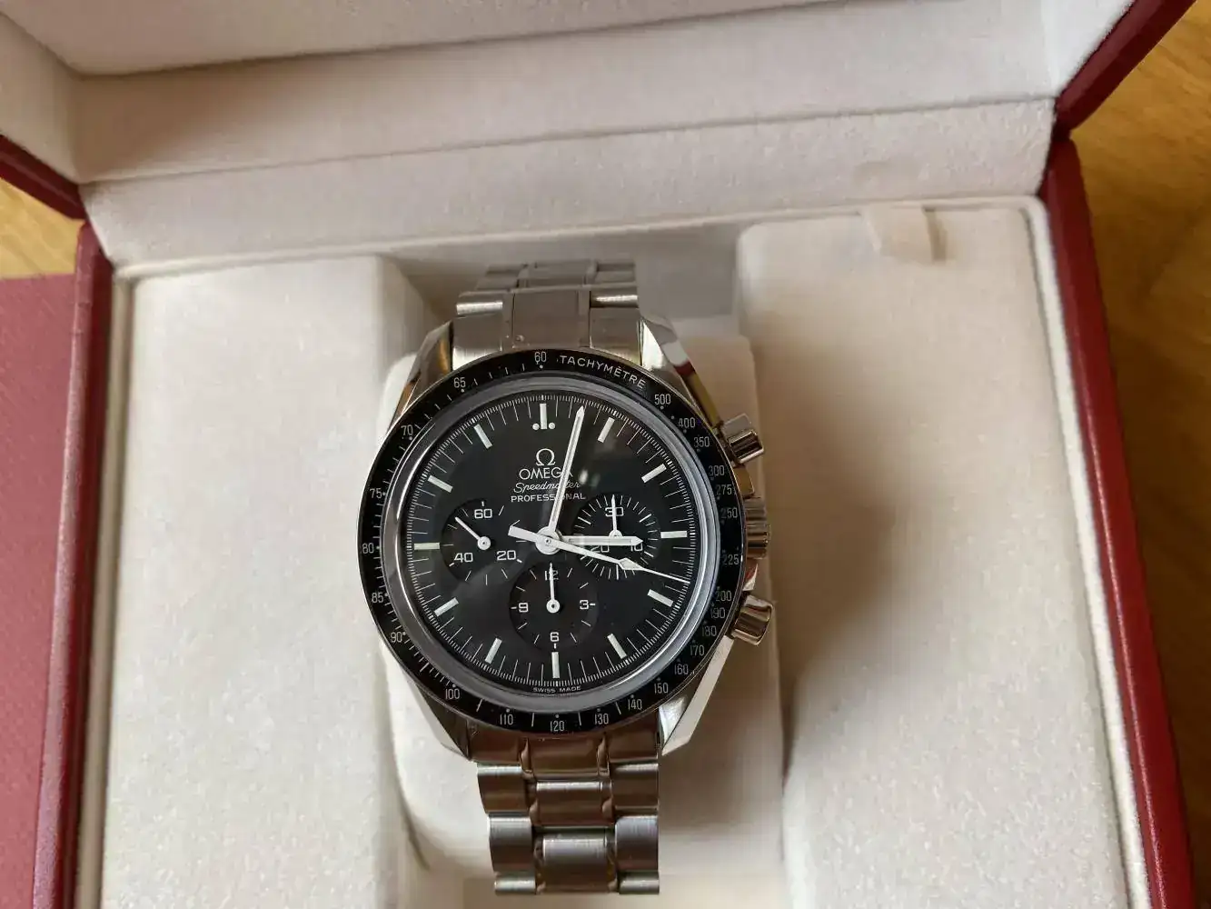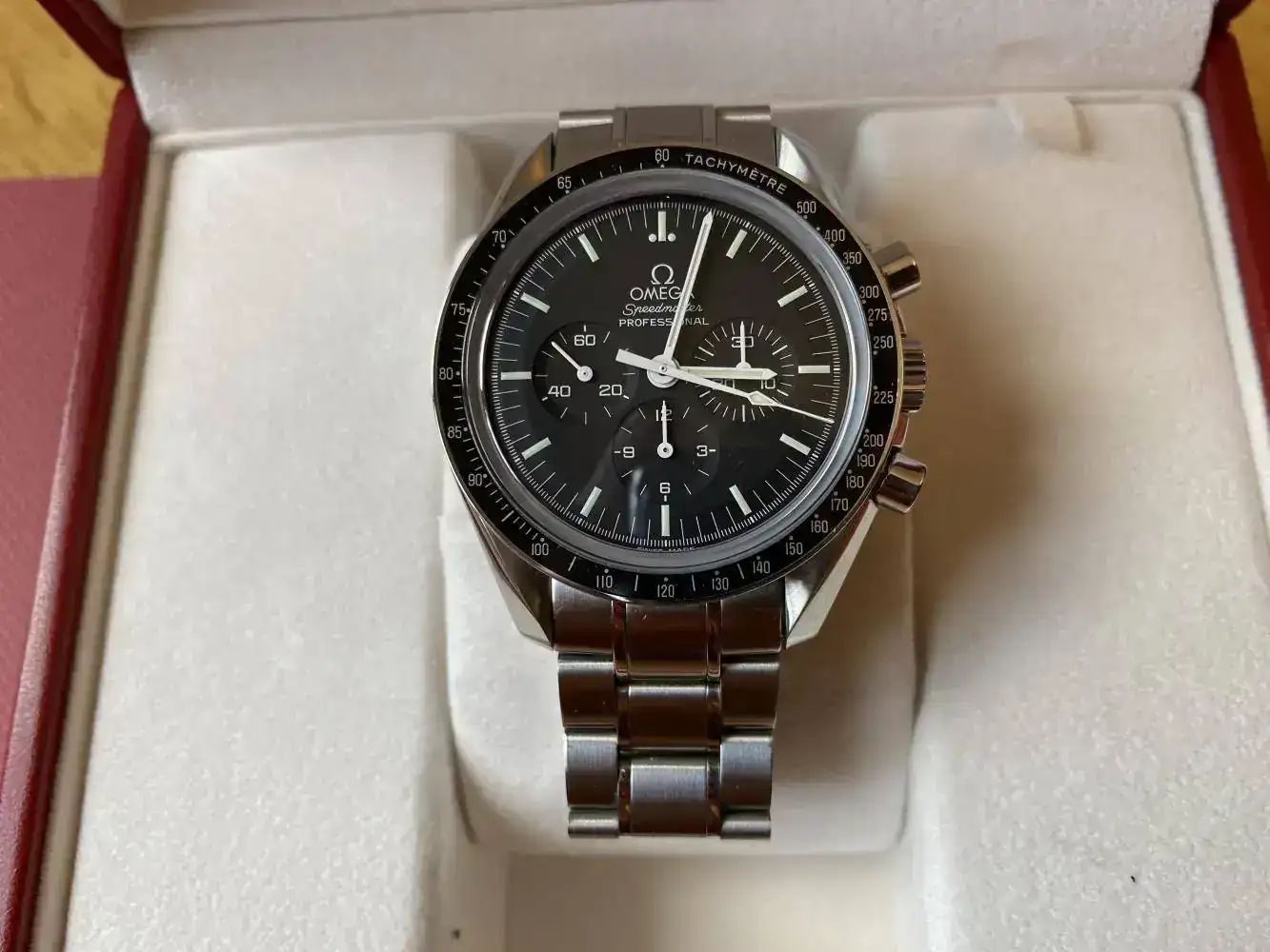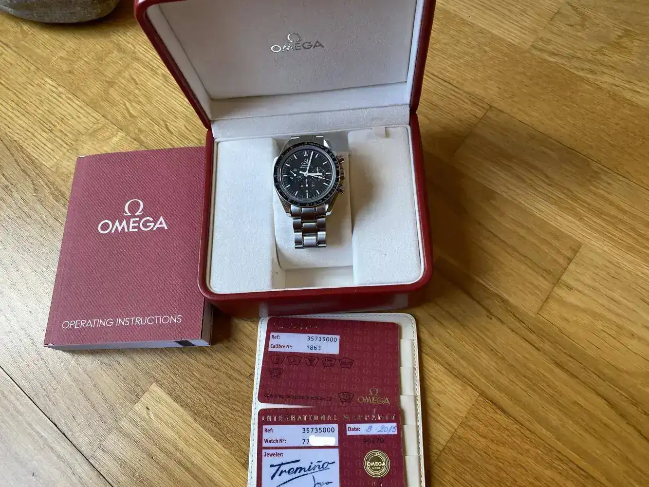 Pongo a la venta este precioso Speedmaster Professional Moonwatch Doble Zafiro comprado en 2015 justo antes de que saliera al mercado la nueva caja con accesorios. Está totalmente nuevo, solo lo he usado una vez y ha estado siempre guardado en su caja. Precio 3500 €,actualmente el nuevo con la nueva caja sale por 5500 €.