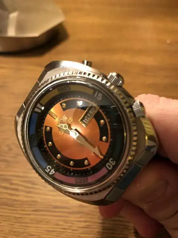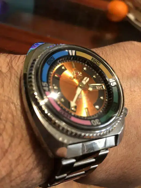 Vendo este Orient SK Crystal en tono naranja, en perfecto estado estéticamente hablando. Probablemente necesite una revisión o ajuste. Es nuevo de stock antiguo, y parece que le cuesta coger reserva de marcha. Lo vendo en 90 y regalo un Seiko automatico antiguo.