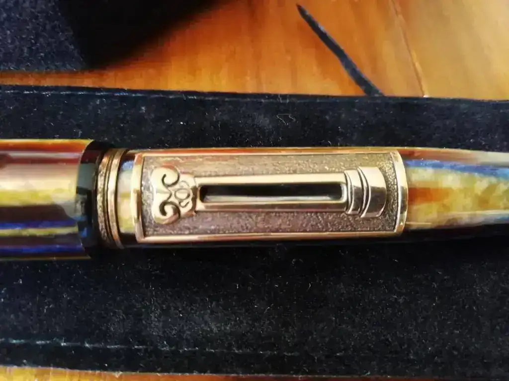 Se trata de una edición limitada de 810 ejemplares, realizada en celuloide de tonos entre azules y marrón /dorado. El clip y los demás detalles son de bronce. El plumín es de oro de 18 quilates en punto B.