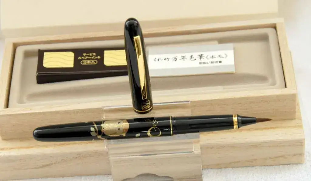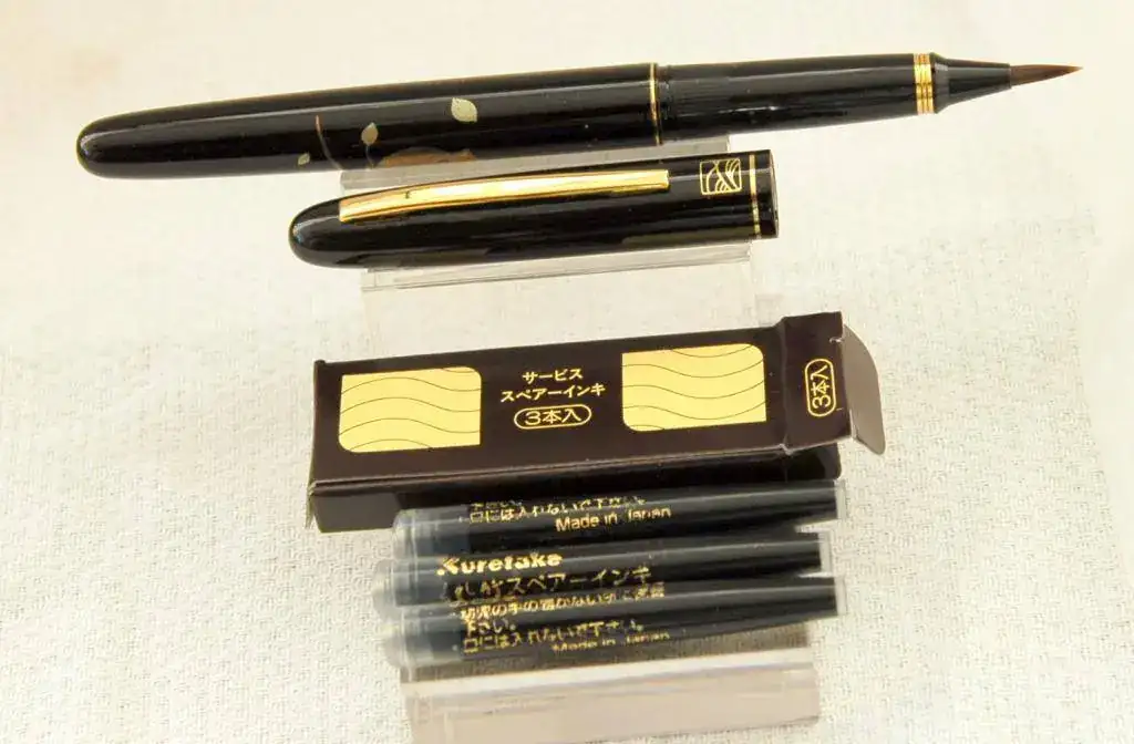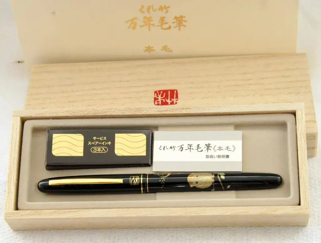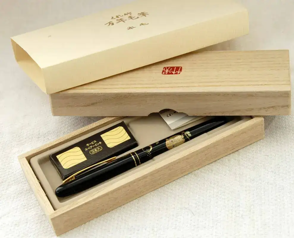 Pluma Kuretake FLYING CRANES MAKIE con laca Urushi y punta de pelo de Comadreja NATURAL.Todo el cuerpo de la Pluma está acabado en laca Urushi con punta de pelo natural de Comadreja - Plumín de la Pluma es un pincel de pelo natural de la cola de la comadreja -A estrenar, 100% auténtico y viene con el paquete completo de la compañía con TRES cartuchos de repuesto en un Box de madera y folleto del artículo en Japonés.