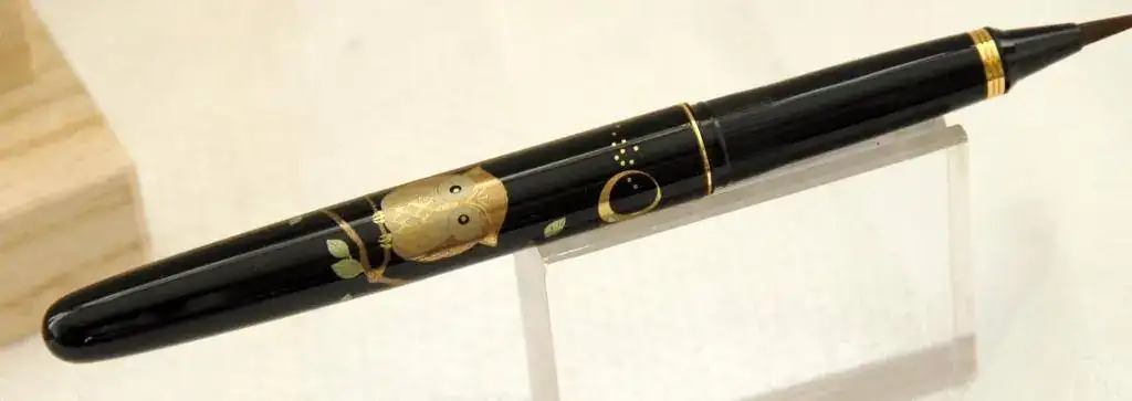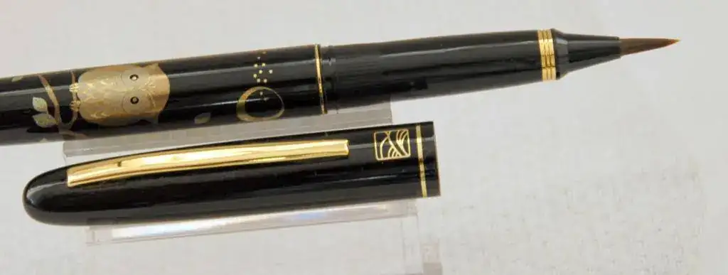 Esta pluma es una excelente Makie con diseño OWL MAKIE. Este es un diseño Makie Búho hecho a mano.Después de hacer el cuerpo se utilizó la tecnología de la laca Urushi. Está hecho de varias capas de laca urushi (casi 20 veces se aplica esta la laca y se pinta a mano mientras que otras marcas y/o modelos usan 8-10 pintadas aproximadamente, por eso se necesita tanto tiempo para fabricar estas plumas / pinceles). La base está recubierta con un aceite de laca menos negro, y esto está salpicado de polvo de cáscara para crear el diseño. Después se cubre completamente con un revestimiento de laca Urushi, y después del secado, el diseño es revelado por bruñido de la laca con carbón vegetal. Así se consiguen diseños brillantes multicolor claramente visibles.