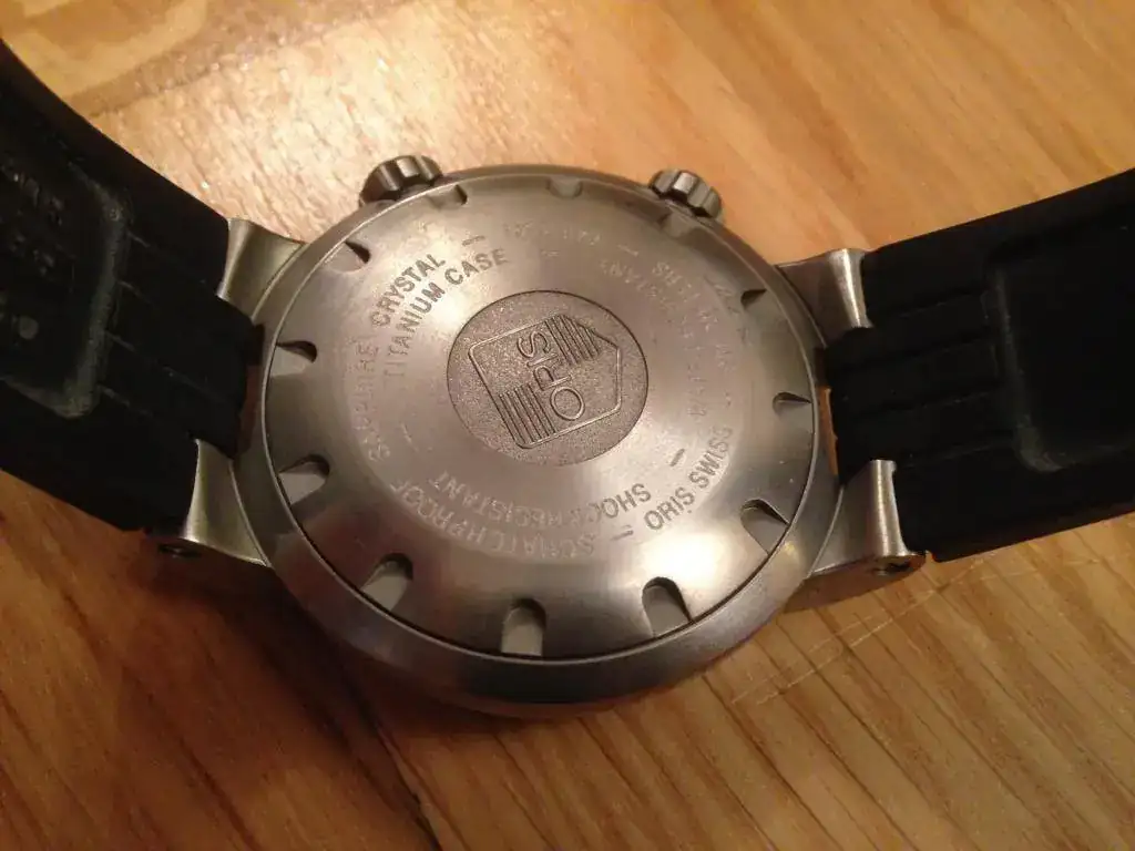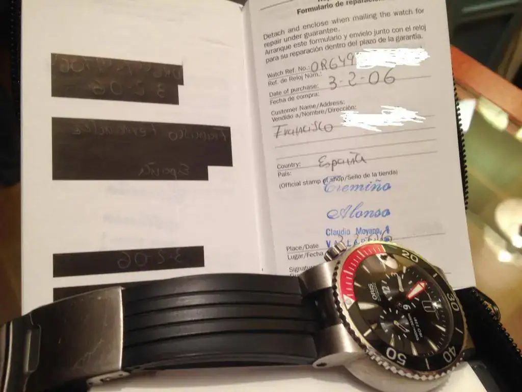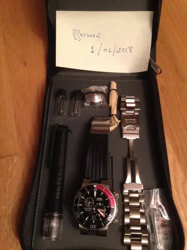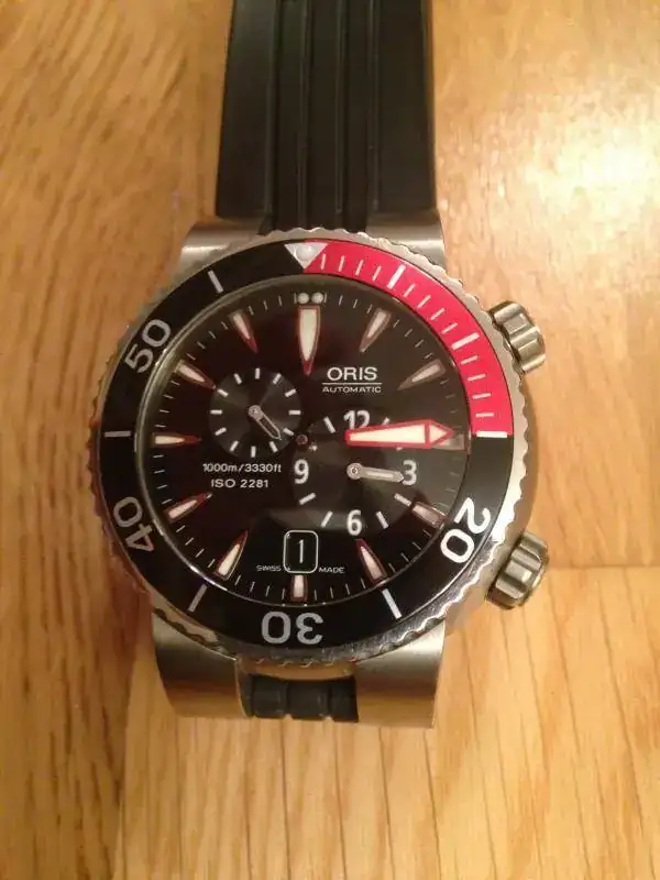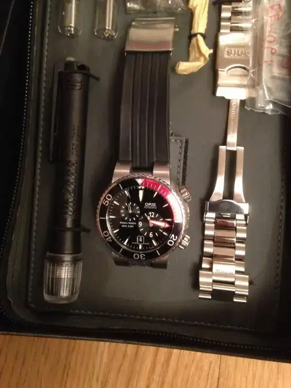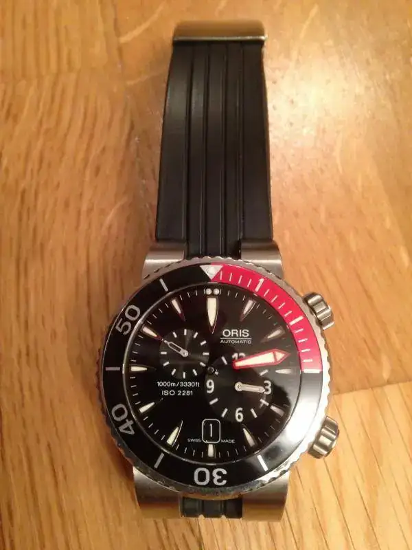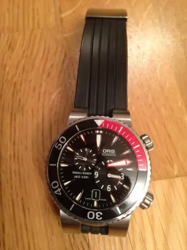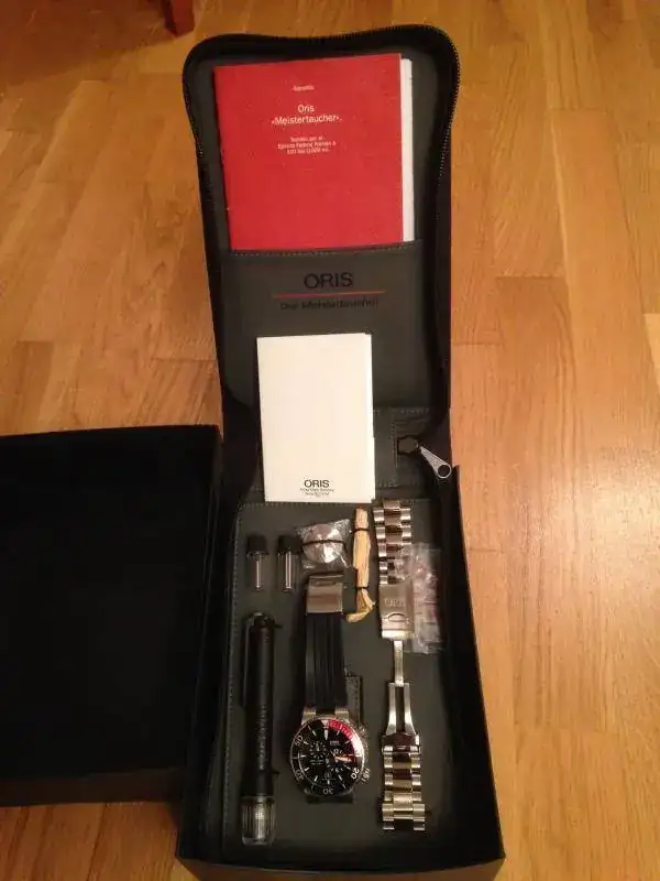 Vendo este preciso relojOris “Meistertaucher”, se trata de un reloj profesional de buceo con movimientoregulador que permite separar el dispositivo de las horas del de los minutos.La caja de 44.00 mm de diámetro es sumergible hasta 1000 metros y va provistade un bisel giratorio unidireccional y válvula para escape de helio. Un grueso cristal zafiro de 4.70 mm asegurauna estanqueidad testada a 100 bar. (1000m). Tanto los índices de la esferacomo la aguja minutera son claramente visible gracias a su gran tamañorecubiertas de tritio. El fondo de la caja y la corona posicionada a las 4 enpunto son roscadas para una mayor seguridad. Tanto el brazalete de caucho comoel de titanio se adaptan perfectamente a la muñeca incluso con el traje debuceo puesto. Se trata de un movimiento calibre Oris 649 de cuerda automática,28800 a/h, 4hz, minutera central y dispositivo descentralizado a las 4 para lashoras y a las 10 para los segundos. Fecha a las 6 en punto.