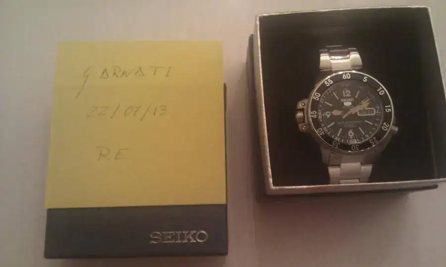 Vendo este Seiko Atlas, dial negro con agujas amarillas, va a entrar uno nuevo y para eso tiene que salir otro. Tiene algunos pelos en el armis, no molesta, pero fácil de solucionar con un pequeño pulido. Comprado a un mercante del foro a finales de septiembre del 2012, así que aún tiene más de un año de garantía. En el protegecorona que mueve el borde del dial tiene un pequeño golpe que no se cómo está ahí, tampoco se nota, pero ahí está. El eslabón que está al lado del cierre tiene una rozadura de haberlo apoyado en la mesita una noche, y aunque no se ve una vez puesto, se puede cambiar con el eslabón sobrante.