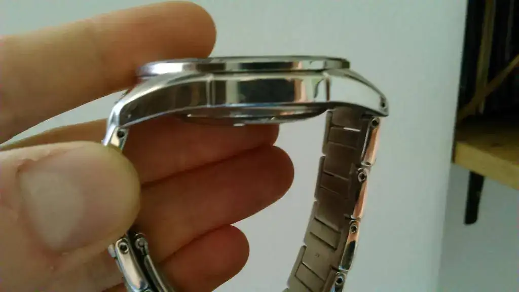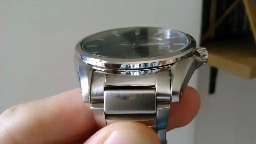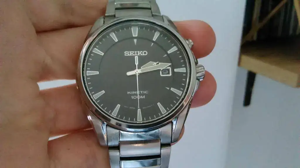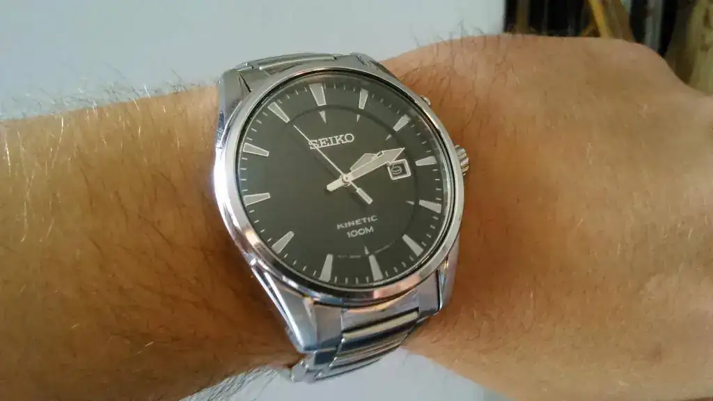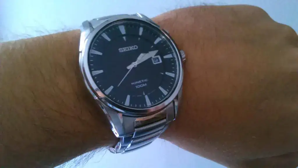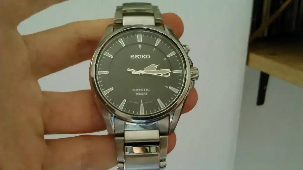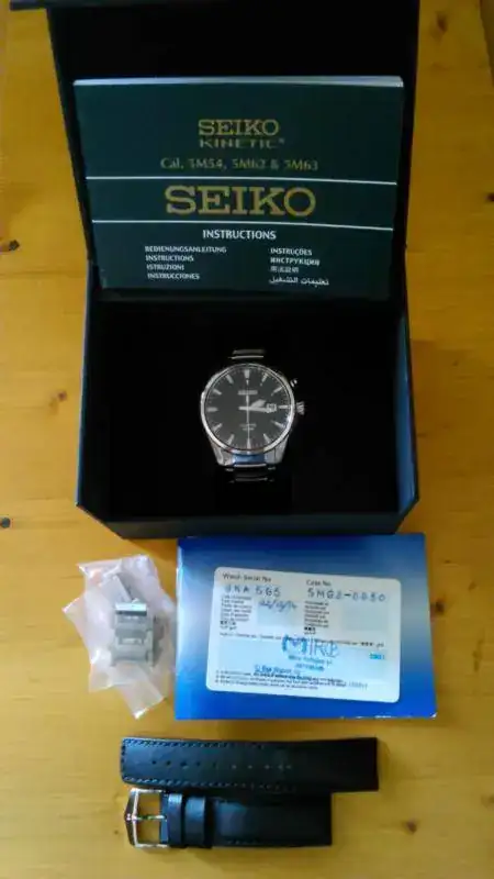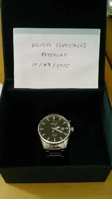 Saco de nuevo a la venta este fabuloso Seiko Kinetic SKA565. A pesar de que me encanta no consigo tener el suficiente "feeling" con él en la muñeca, así que prefiero que lo disfrute otra persona. El reloj está en muy buen estado en general, ya que ha tenido muy poco uso (lo llevé seguido los dos primeros meses después de comprarlo, y después lo he usado de forma intermitente muy poco). Lo único que tiene es un raspón y alguna marca en uno de los terminales y en parte del primer eslabón inferior, fruto de un ajuste del terminal muy poco afortunado por mi parte (hay una foto en la que se claramente), pero a parte de esto (y de algún pelillo suelto en el brazalete, que es inevitable) está en perfectas condiciones. La esfera es negra brillante, no mate, y es muy bonita puesta a la luz. El diámetro de la caja, que es de acero pulido a espejo, es de 42mm sin la corona y la anchura entre asas es de 22mm, lo cual le da un aspecto muy equilibrado (se puede apreciar cómo luce en mi muñeca, que es de 16.) El brazalete tiene partes cepilladas y partes pulidas, y es de eslabones macizos, pero los terminales son de chapa. El movimiento es el 5M62 de cuarzo kinetic, y carga muy bien, aunque un pelín más lento que su hermano de gama, el 5M82; con una reserva de marcha que puede alcanzar los 6 meses totalmente cargado (hay un indicador que se activa con el pulsador a las 2 que indica el nivel de carga).