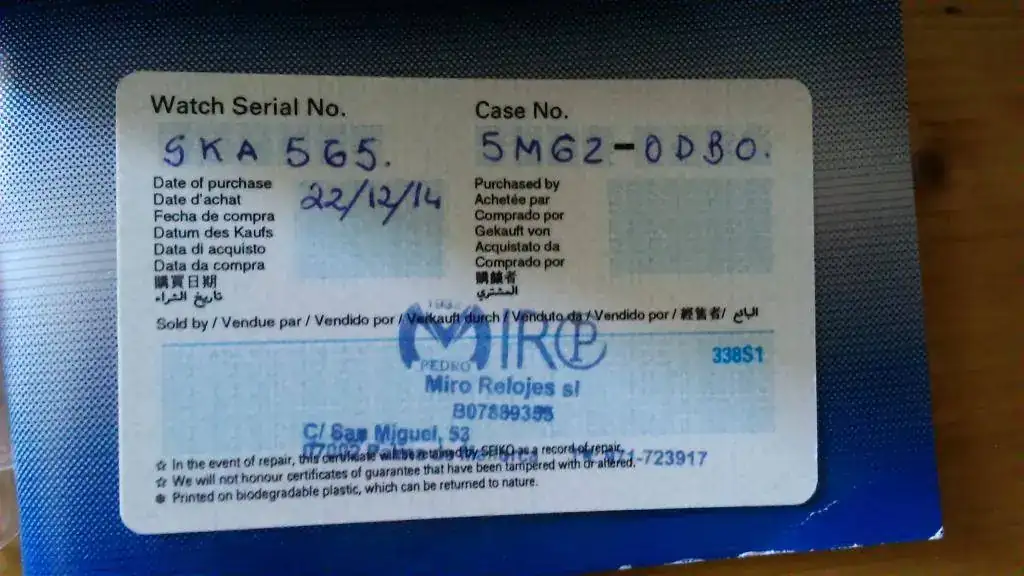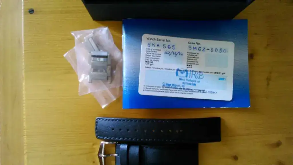 Como se puede apreciar, tiene bastante garantía aún en vigor, y fue adquirido en CO tienda física. El reloj se acompaña con el estuche, la garantía sellada y fechada, el libro de instrucciones y los eslabones sobrantes. Adjunto también una correa de piel negra con forro de caucho Hirsch modelo Runner, que le queda preciosa, con tan solo una puesta y dos agujeros extra.